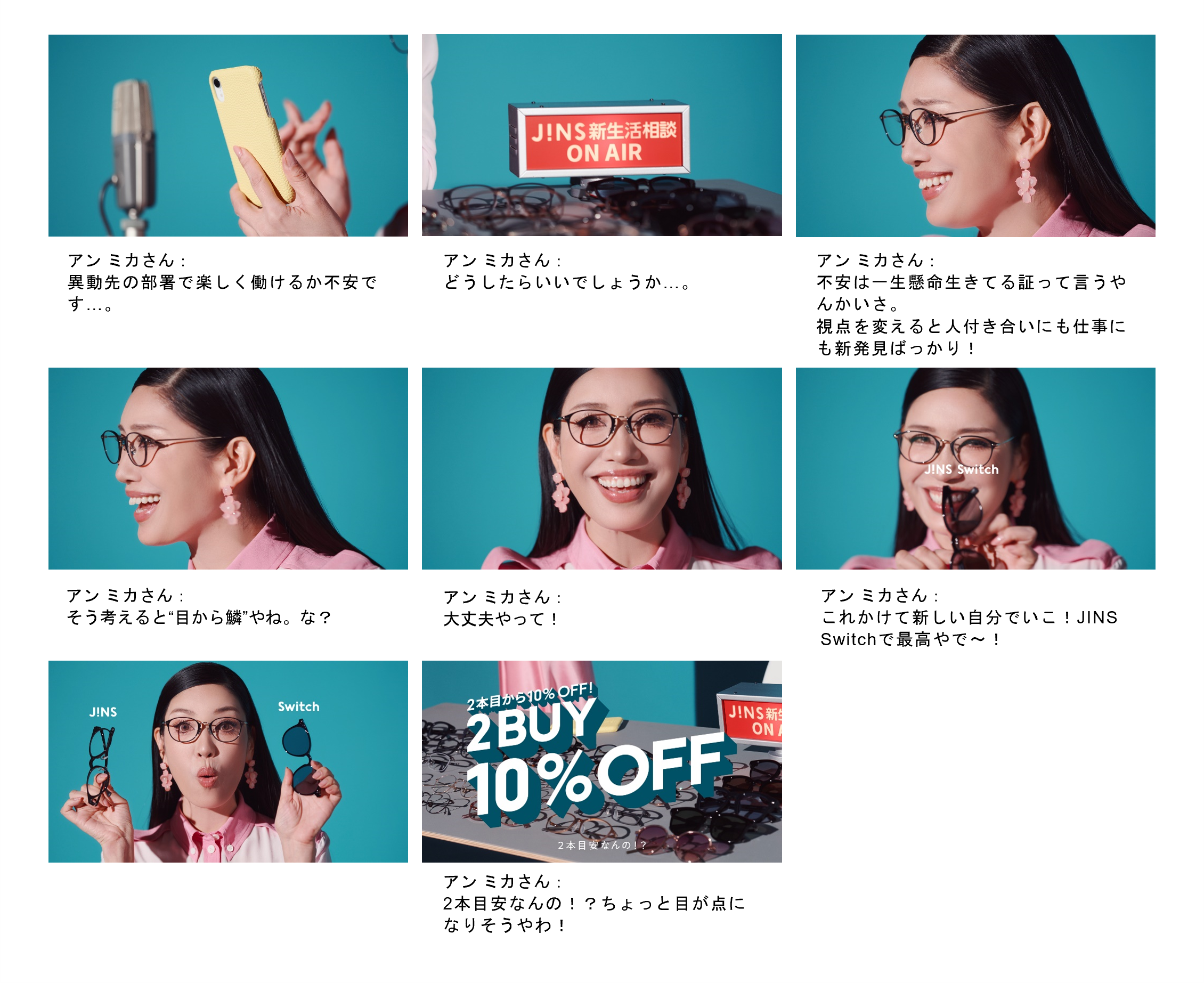 本キャンペーンの開始に際してお届けするCM「JINS 新生活お悩み相談。大丈夫やって!」は、ラジオDJに扮したアン ミカさんがリスナーから届いた新生活にまつわる様々なお悩みに回答するストーリーです。メガネをかけたアン ミカさんがラジオブースでリスナーからのお悩みを読み上げるシーンからスタートします。普段コメンテーターとして的確で歯に衣着せぬコメントで活躍するアン ミカさんが、どんなお悩みも強引に“目”と絡めて、少し大袈裟な関西弁で「大丈夫やって!」と即答。新学期を迎えクラスに馴染めるか心配する学生、就職した会社に怖い上司がいないか心配する新社会人、新社会人とどう接したらよいか分からない上司、リスナーから寄せられるどんなお悩みも、メガネで解決を薦めます。
