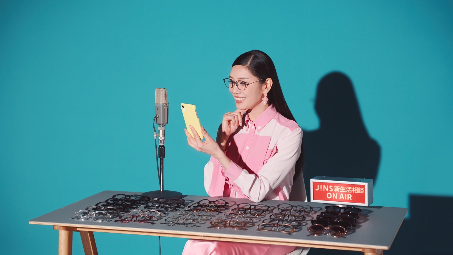 多くのメガネが並んでいるテーブルを前に、チェアに腰かけるラジオDJに扮したアン ミカさん。各世代のリスナーから寄せられる新生活のお悩み相談に対して目にまつわる話で答え、JINSのメガネを薦めます。
