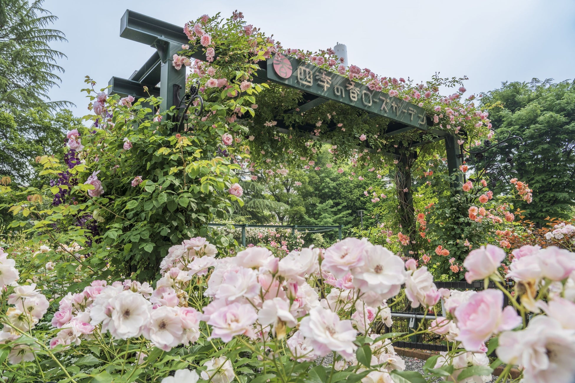 また、園の名を冠した爽やかな紅茶を感じる香りのシンボルローズ「四季の香」をはじめ、ダマスクやスパイシーなど6種類の香りを楽しめる「香りのローズガーデン」、赤やピンクなど色とりどりのバラが咲く「色彩のローズガーデン」など、さまざまなバラが園内を彩ります。大江戸線光が丘駅にも近く、入園無料のローズガーデンです。期間中は閉園時間を1時間延長していますので、ゆっくりと園内散策をお楽しみください。