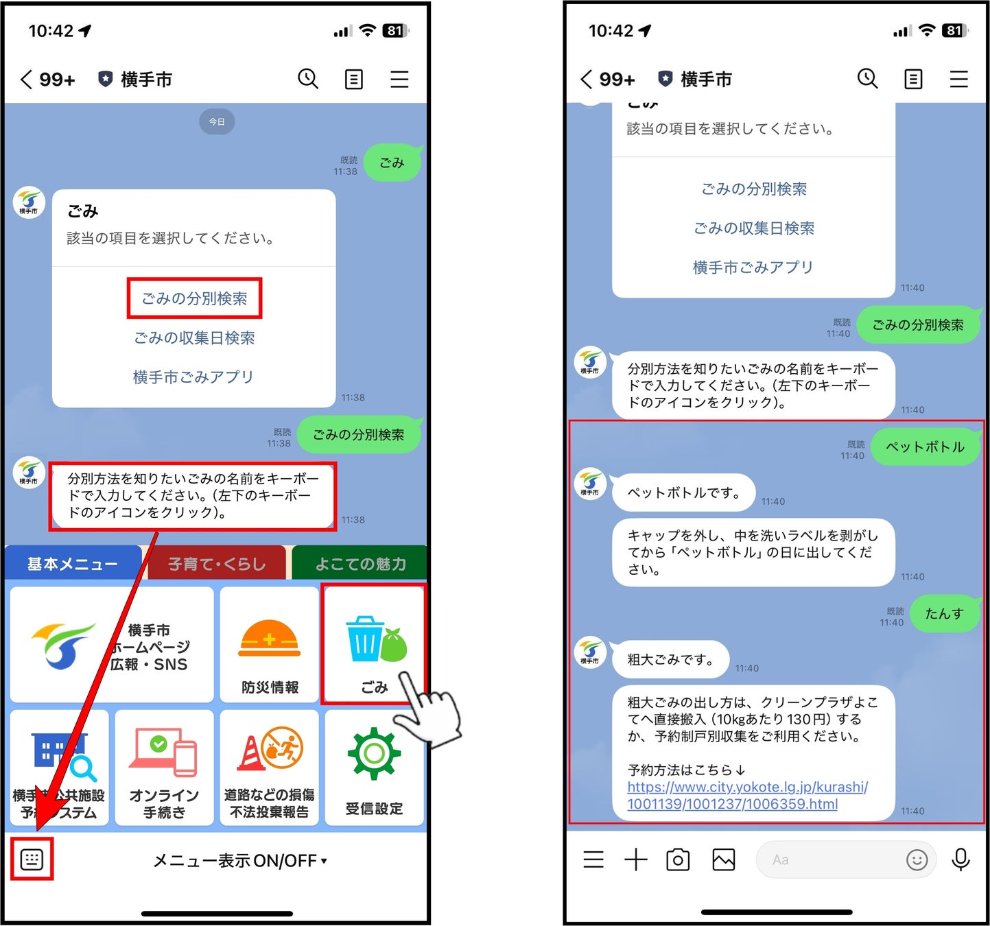 「ごみ」では、「ごみの一問一答機能」を搭載しております。LINEのトーク画面に直接「ペットボトル」「たんす」などの破棄したいごみの具体名を入力することで、分別方法や捨てる際のコツを自動返答します。