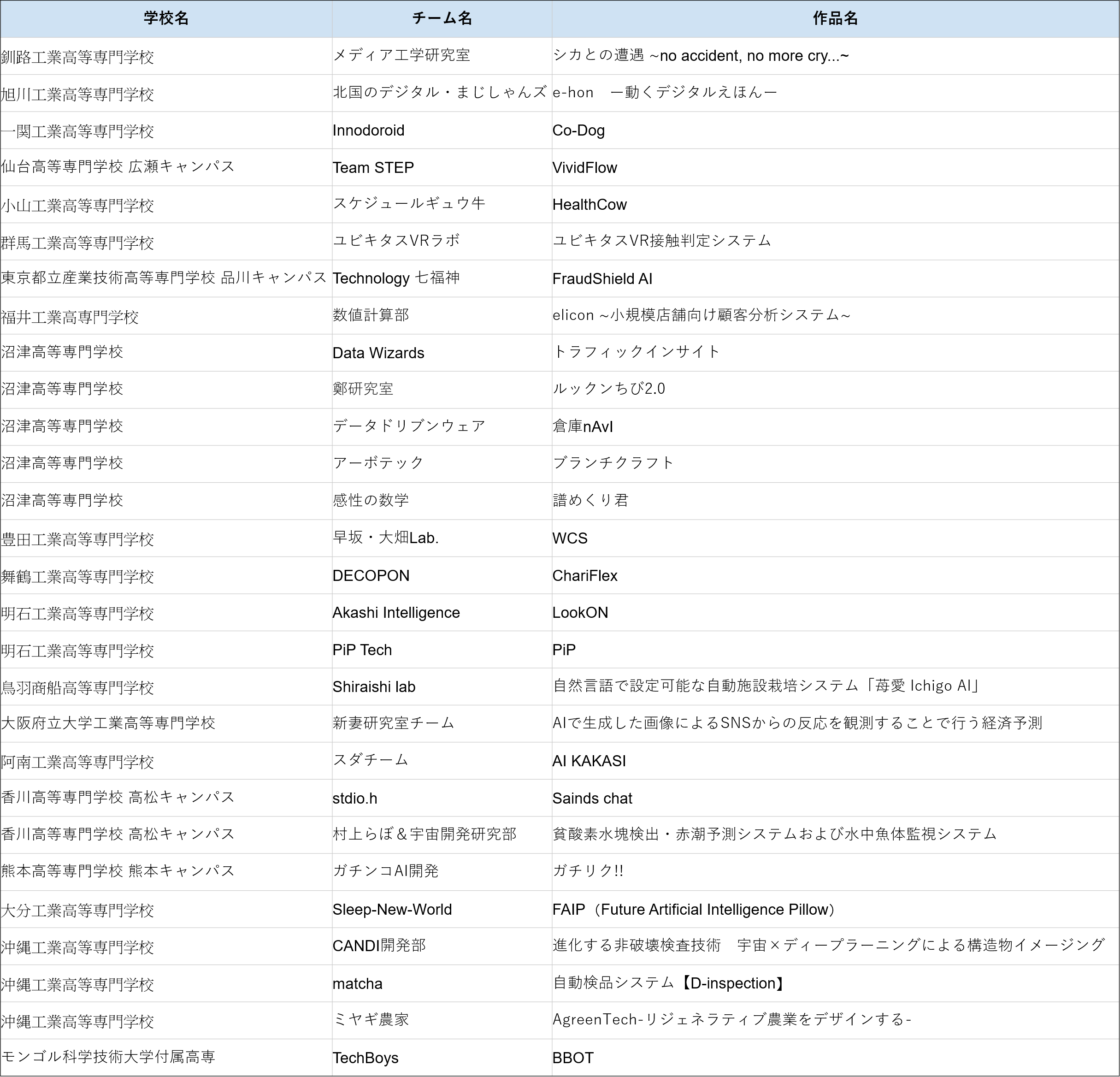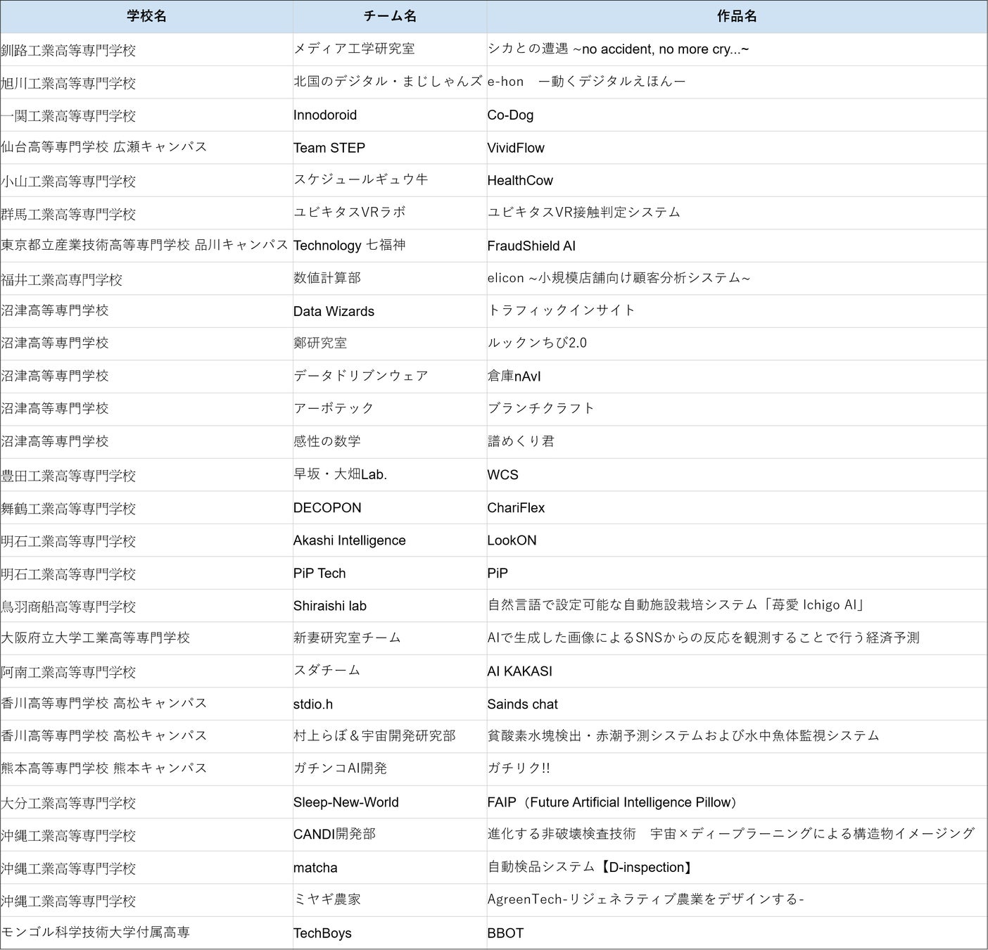 高専生による「ものづくり×AI」のビジネスコンテスト2次書類審査結果を発表~20高専28チームが通過、面談審査へ進出。