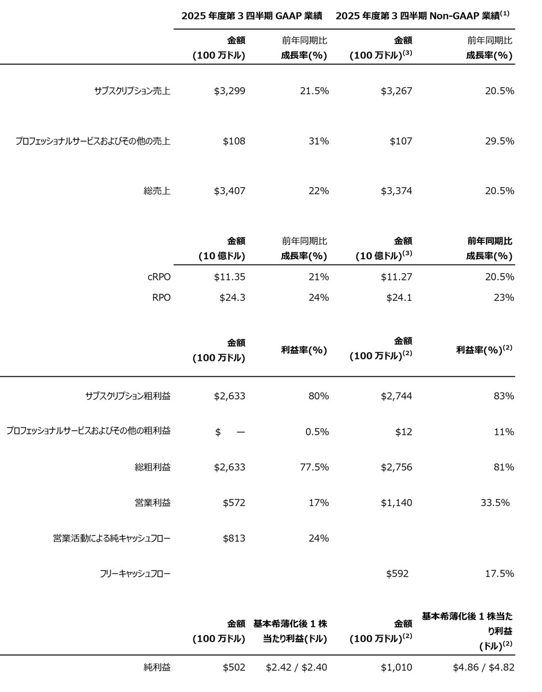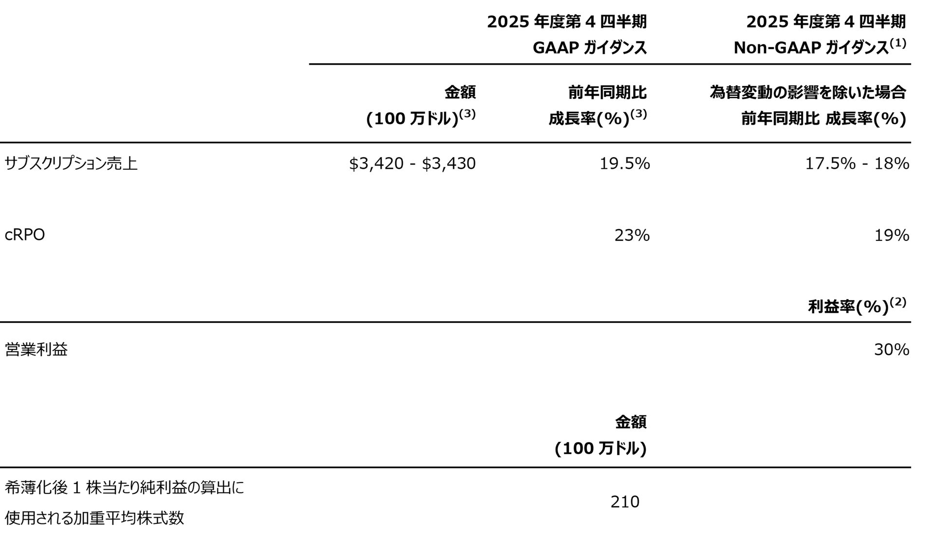 3. GAAPベースのサブスクリプション収益およびGAAPベースのサブスクリプション収益とcRPOの成長率に関するガイダンスは、米ドル以外の通貨で報告する事業体について、2025年9月の30日間の平均為替レートに基づいています。