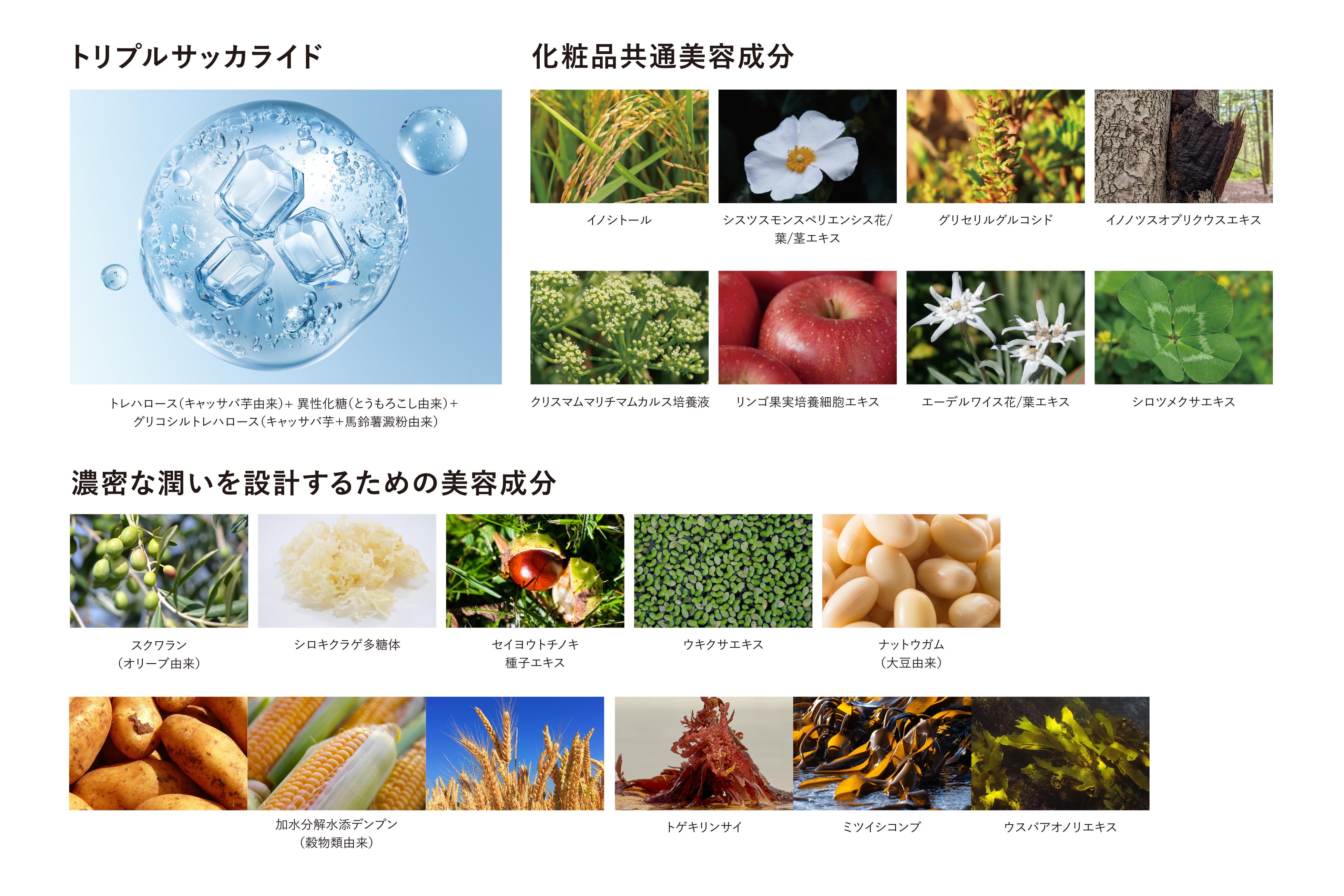 肌の水分バランスを整え角質層を潤いで満たすために、水分を「浸透(※2)」させ、「抱え込み」、「ラッピング」して閉じ込める“ウォーターチャージシステム”を採用。