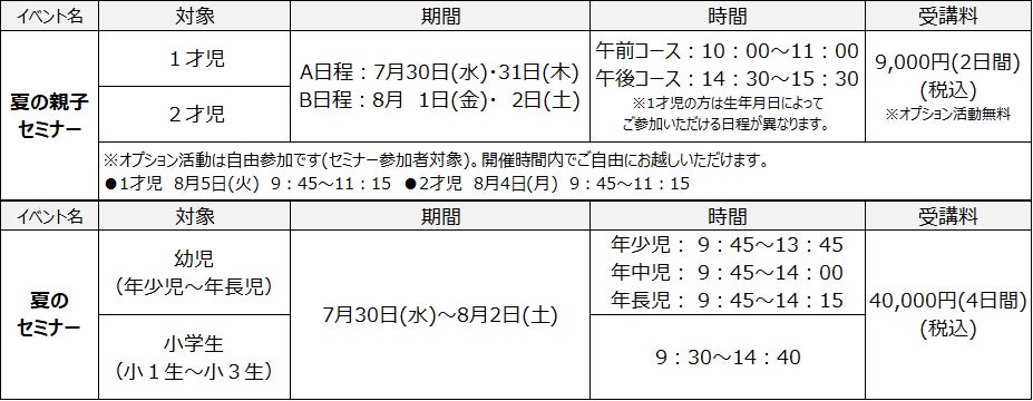 1才児・2才児向けには、親子で参加できる「夏の親子セミナー」を2日間にわたって実施します。
