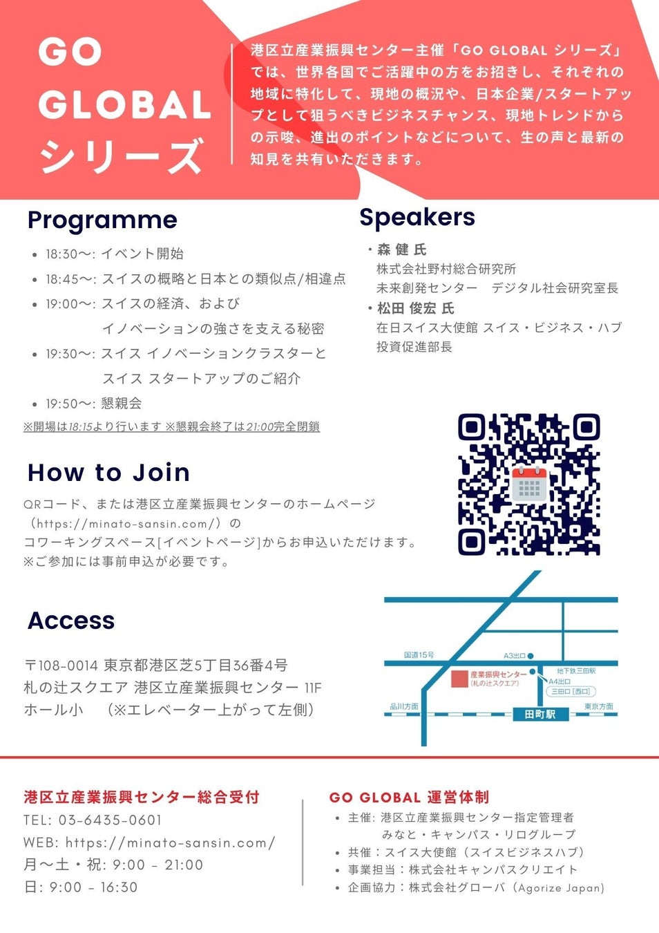 港区立産業振興センター主催、世界各国におけるスタートアップエコシステムのキーパーソンと繋がることができるセミナー「GO GLOBAL」 第5弾 スイス編。
