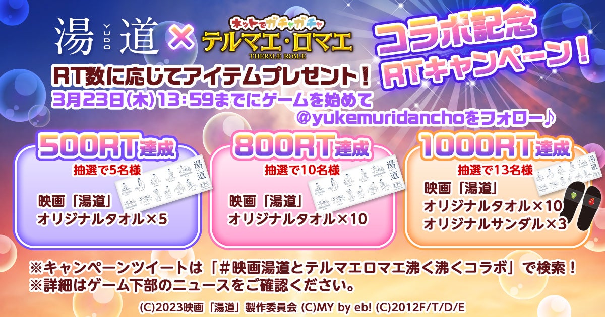 3月23日(木)13:59までにゲーム『テルマエ・ロマエ ガチャ』を始めて、公式Twitterにて期間中フォロー&RTしていただいた方の中から抽選で「湯道」オリジナルアイテムをプレゼントいたします。
