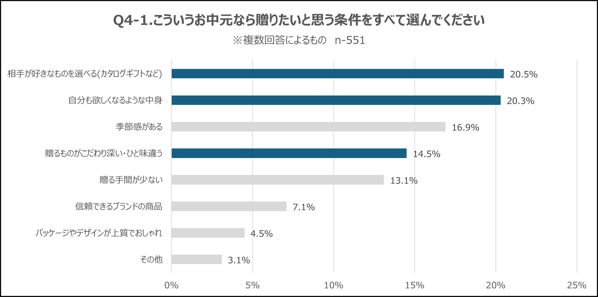 「こういうお中元なら贈りたいと思う条件」について尋ねたところ、最も多かったのは「相手が好きなものを選べる」(20.5%)・「自分も欲しくなるような中身」(20.3%)でした。