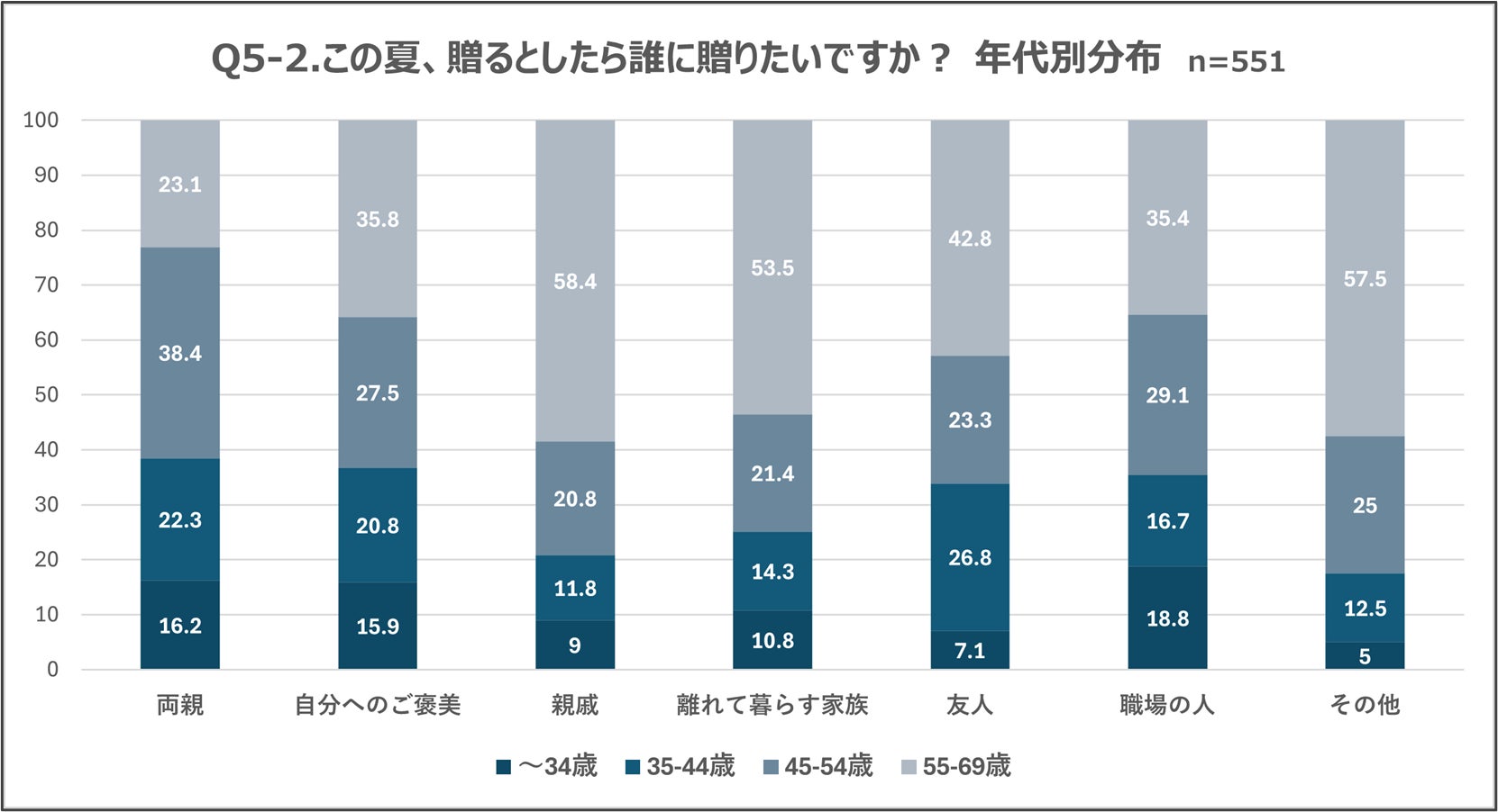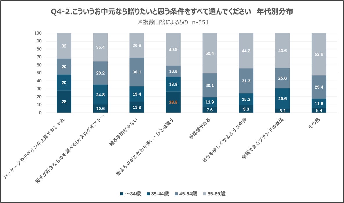 さらに注目すべきは、「こだわり深い・ひと味違うギフト」(14.5%)の項目で、特に34歳以下の若年層ではこの傾向が強く、”自分らしさを反映できるお中元”を求める声が目立ちました