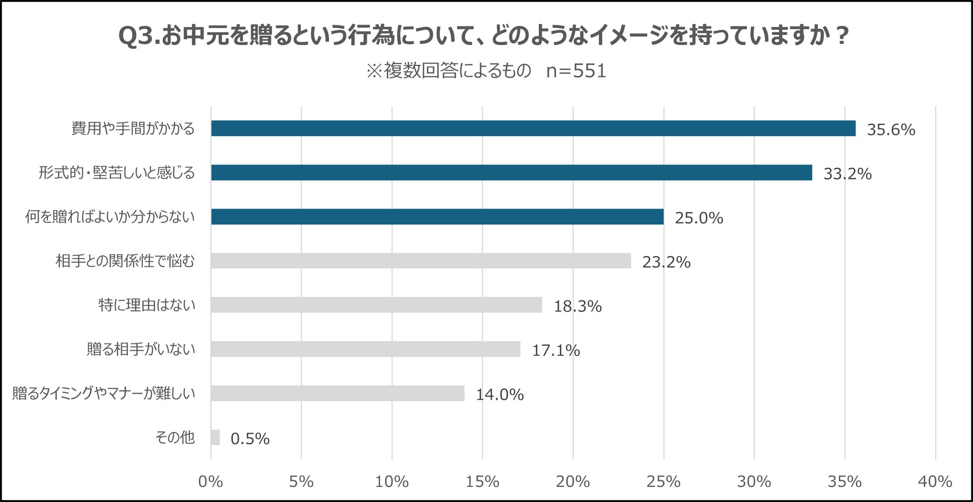 お中元を贈ることについてのイメージは、「費用や手間がかかる」(35.6%)・「形式的・堅苦しいと感じる」(33.2%)・「何を贈ればよいか分からない」(25.0%)が上位を占めています。