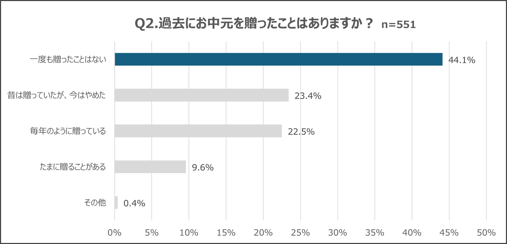 過去にお中元を贈ったことがあるかを尋ねたところ、「一度も贈ったことがない」が44.1%と最多となりました。