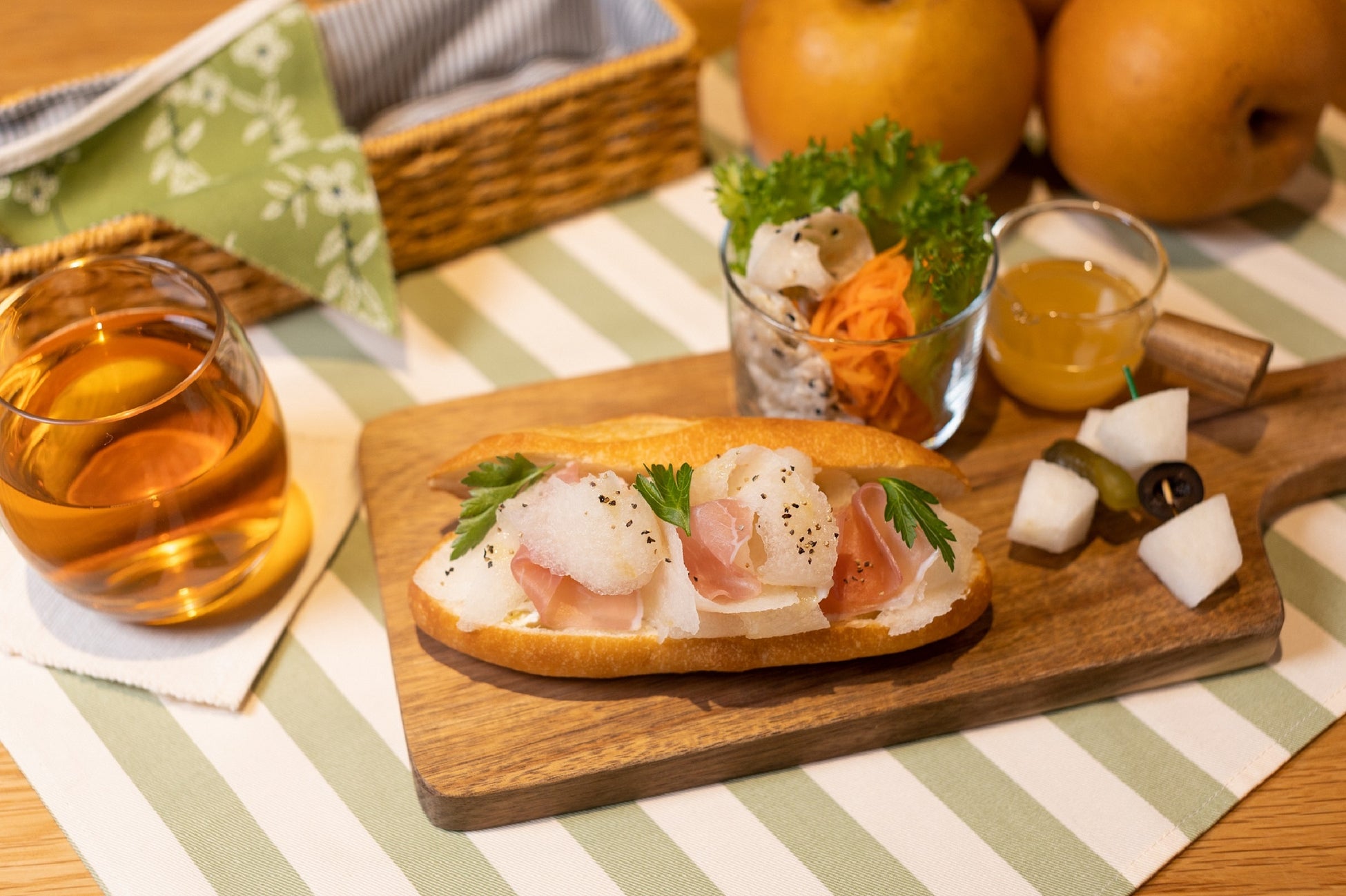 ったパンに、生ハムと採れたてのみずみずしい梨を挟んで作るサンドイッチは格別!生ハムの塩気と梨の甘みによる絶妙なハーモニーを楽しめます。加えて、梨ドレッシングで食べるサラダも用意します。爽やかな秋の朝に、梨の木々に囲まれて、旬の梨を味わい尽くす特別なひとときです!