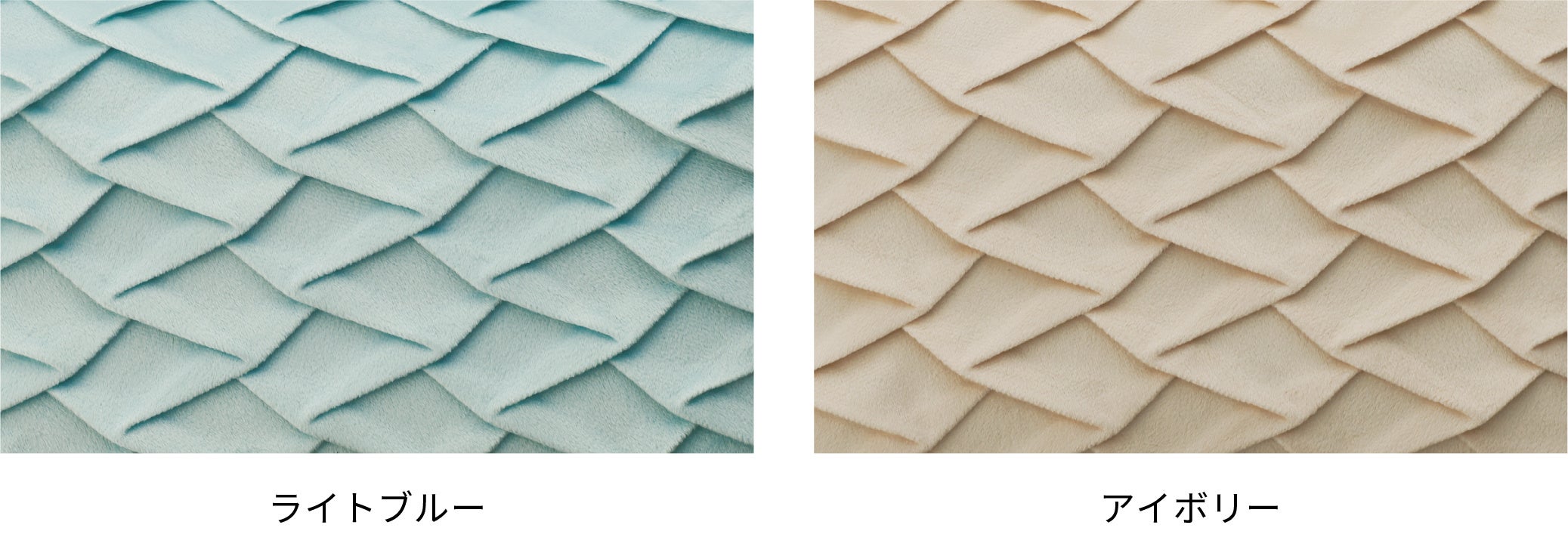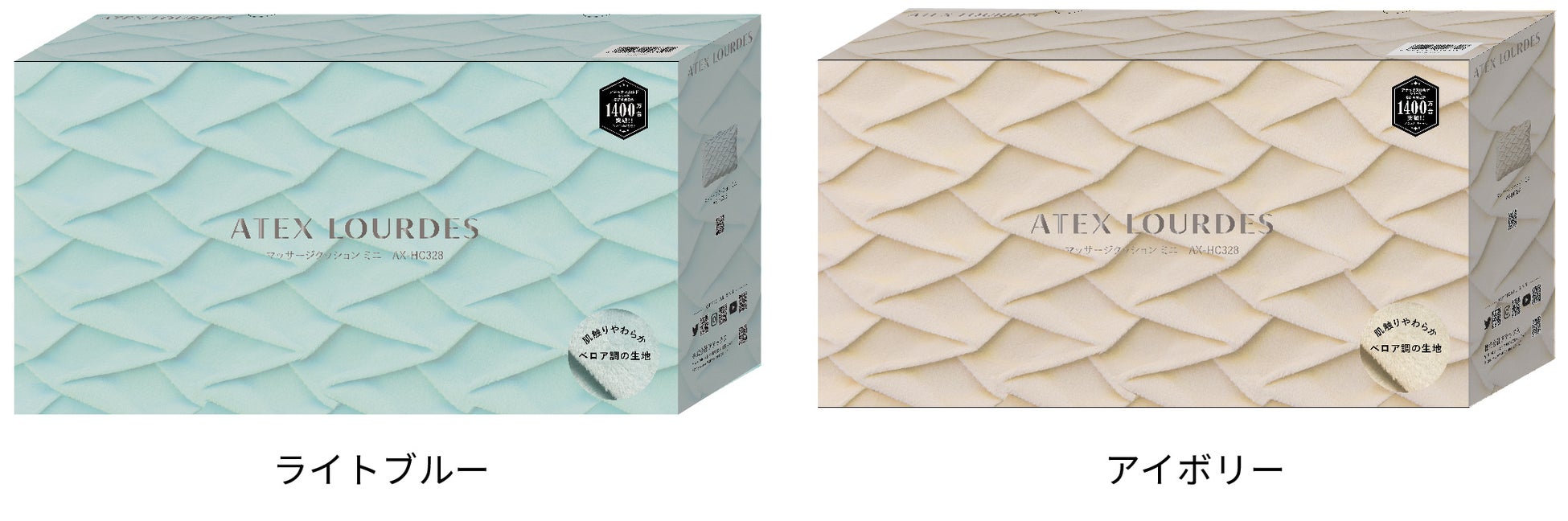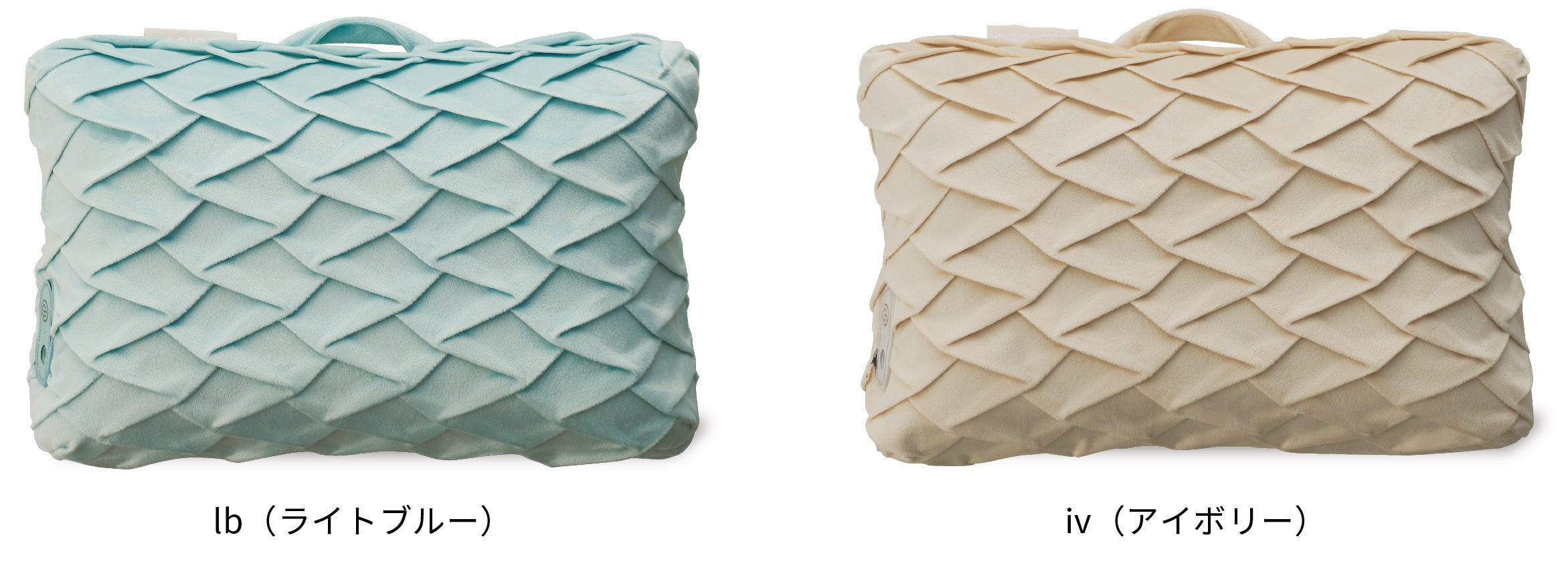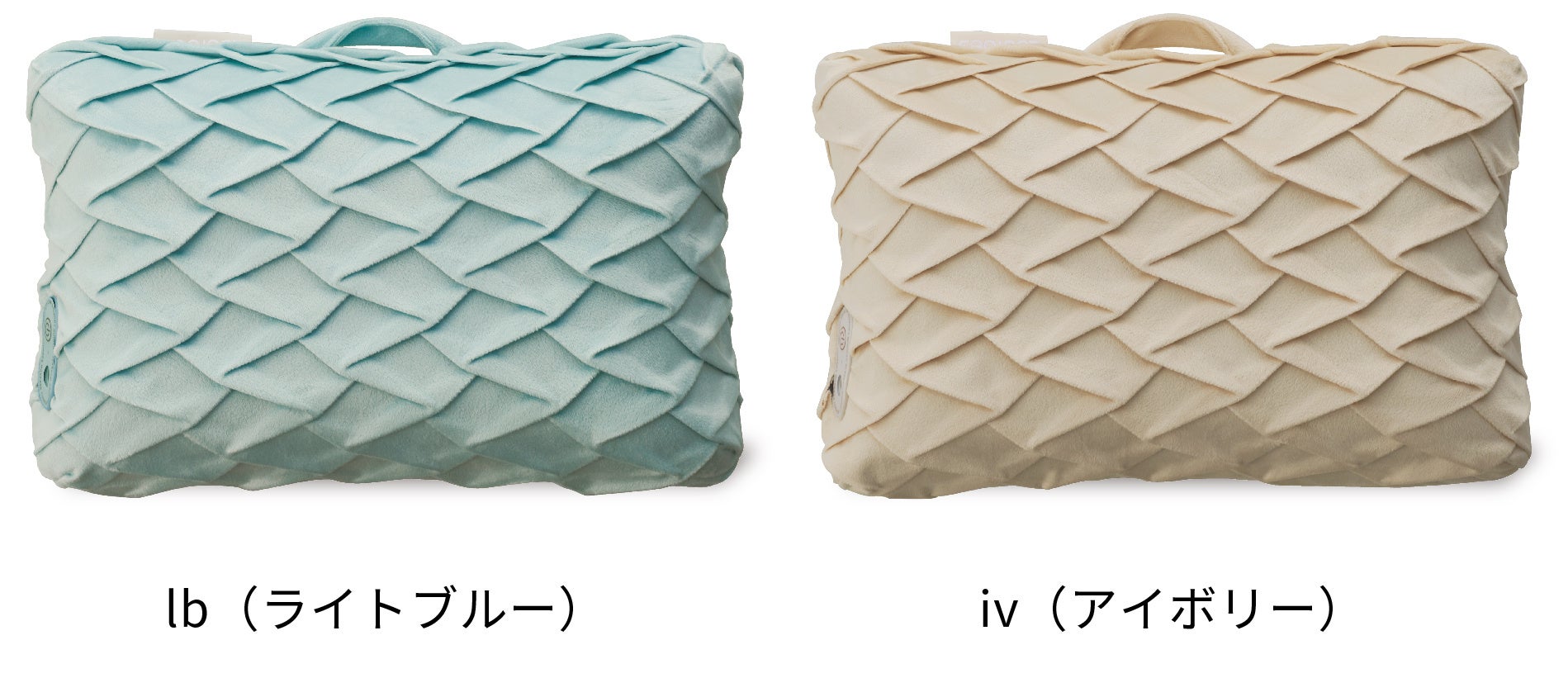 「マッサージクッション ミニ」はコンパクトでさまざまな部位に使用しやすいと好評です。このたび、肌触りが滑らかなベロア調生地にプリーツ加工を施した新色が 登場します。インテリアにも馴染みやすいライトブルーとアイボリーの2色展開です。