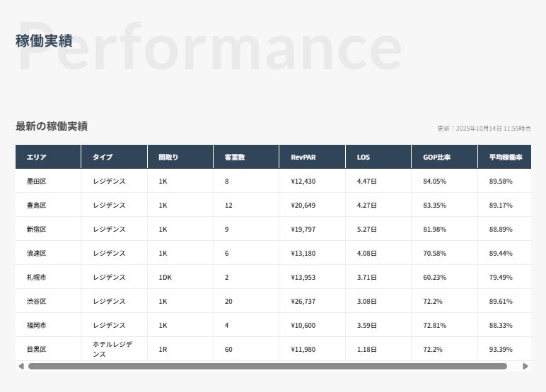 エリア・物件タイプ・間取り・客室数別の、RevPAR、LOS(平均滞在日数)、GOP比率、平均稼働率など、事業検討に欠かせない最新の稼働実績データを公開しました。これまで問い合わせが必要だった情報を開示することで、担当者は初期段階から収益性の仮説を立てやすくなり、物件選定や投資判断をスピーディに進めることが可能になります。
