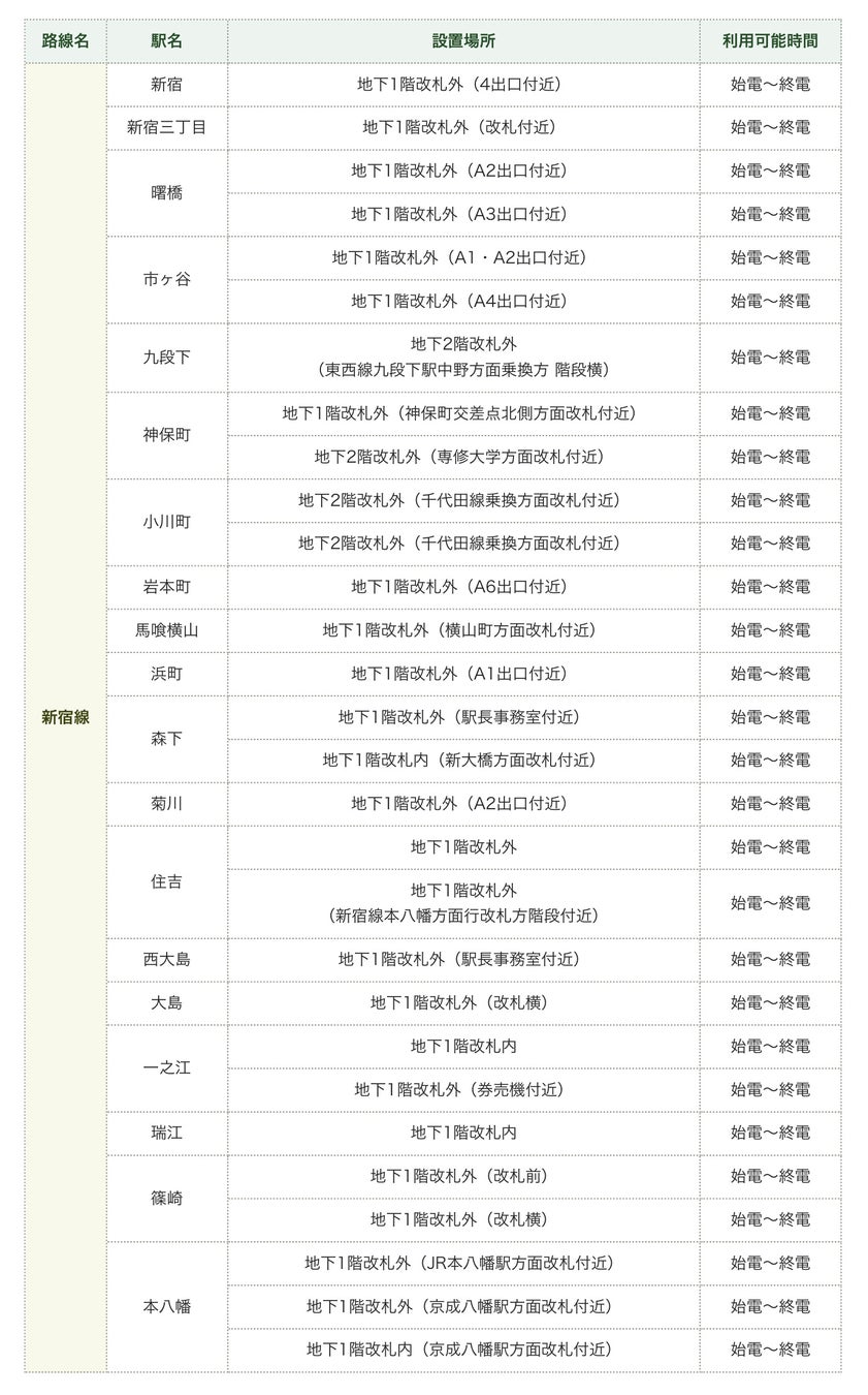 都営新宿線19駅29か所(詳細は「レンタルスポット(傘立て)新規設置場所一覧」のとおり)