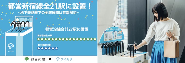 これにより、都営新宿線全21駅で「アイカサ」を利用できるようになり、首都圏初の地下鉄路線での全駅展開となります(※2)。 本取組を通じて、沿線をご利用いただいているお客さまに、雨の日でもより便利にそして快適に都営地下鉄をご利用いただくとともに、