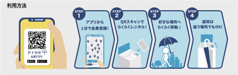 『アイカサ』は、"雨の日を快適にハッピーに"と"使い捨て傘をゼロに"をミッションに2018年12月にサービスを開始した日本初の本格的な傘のシェアリングサービスです。突発的な雨にもビニール傘をその都度購入せずに、駅や街中で丈夫でサステナブルな『アイカサ』を借り、雨が止んだ際には最寄りの傘スポットに傘を返却することでエコに貢献しながら(※)、手ぶらで便利に移動ができるのが特徴です。現在は、アプリ登録者数50万人を超え、東京駅や新宿駅をはじめとした都内全域と関東、関西、愛知、岡山、福岡、佐賀など12都道府県で展開し、スポット数1350箇所以上に設置しています。
