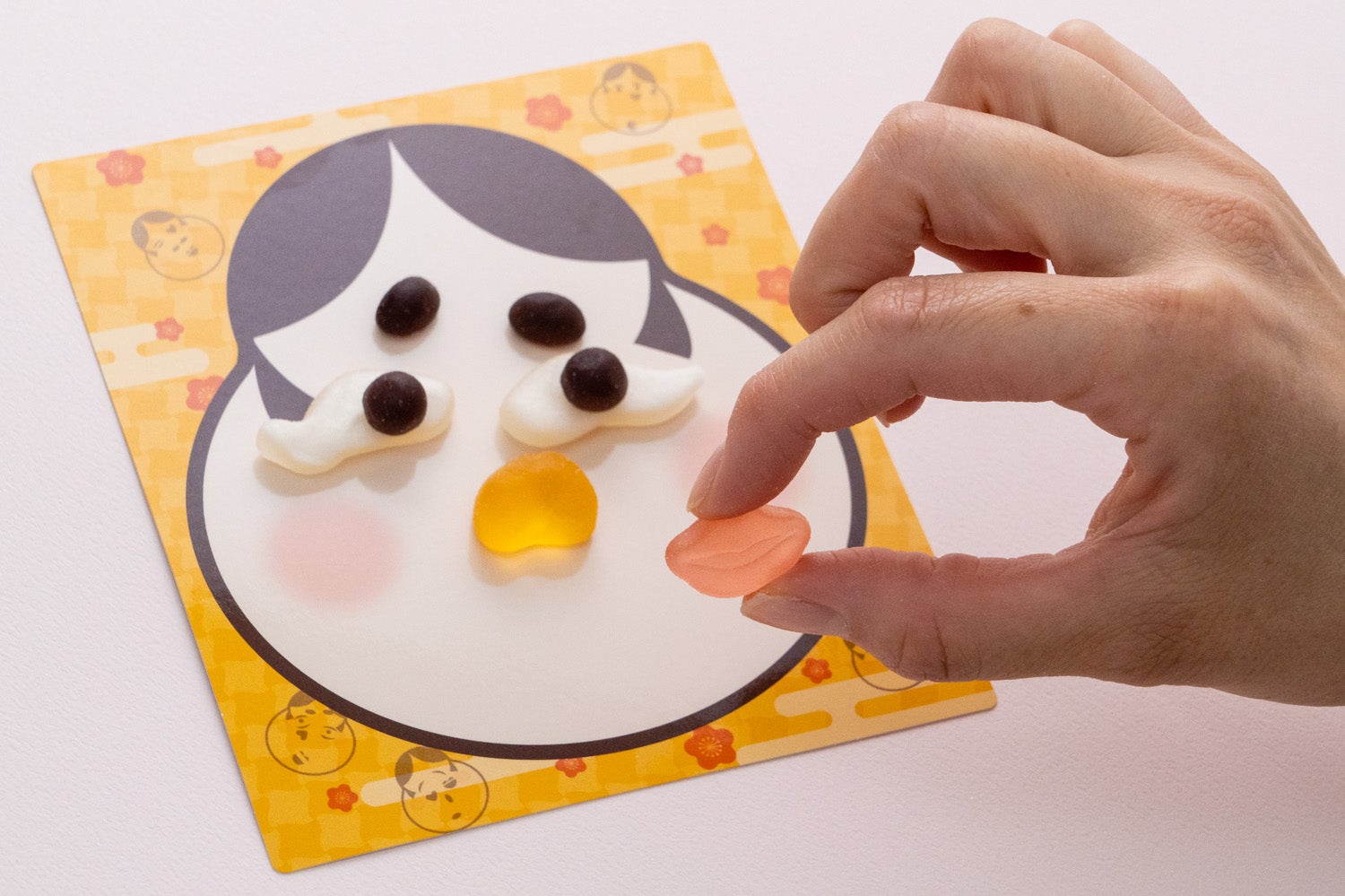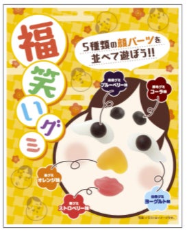 お正月の代表的な遊びである福笑いがグミでできる「福笑いグミ」が今年も登場。付属の福笑いの台紙に5種類の顔パーツのグミを並べて、福笑いを楽しめます。