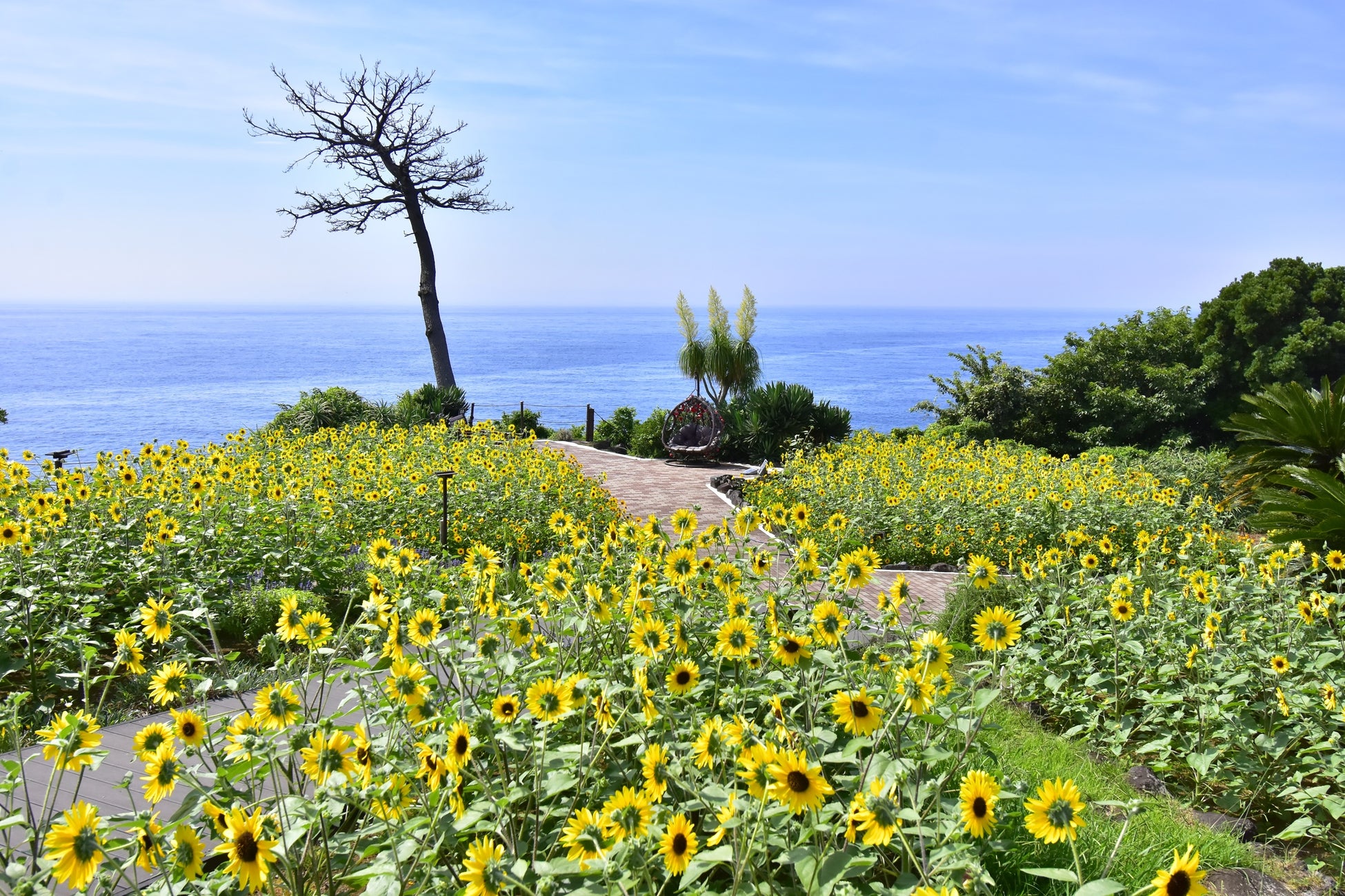 伊豆の景勝地・城ケ崎海岸の絶景を望む花畑が、青い海とヒマワリの黄色い花に彩られ見事なコントラストになります。