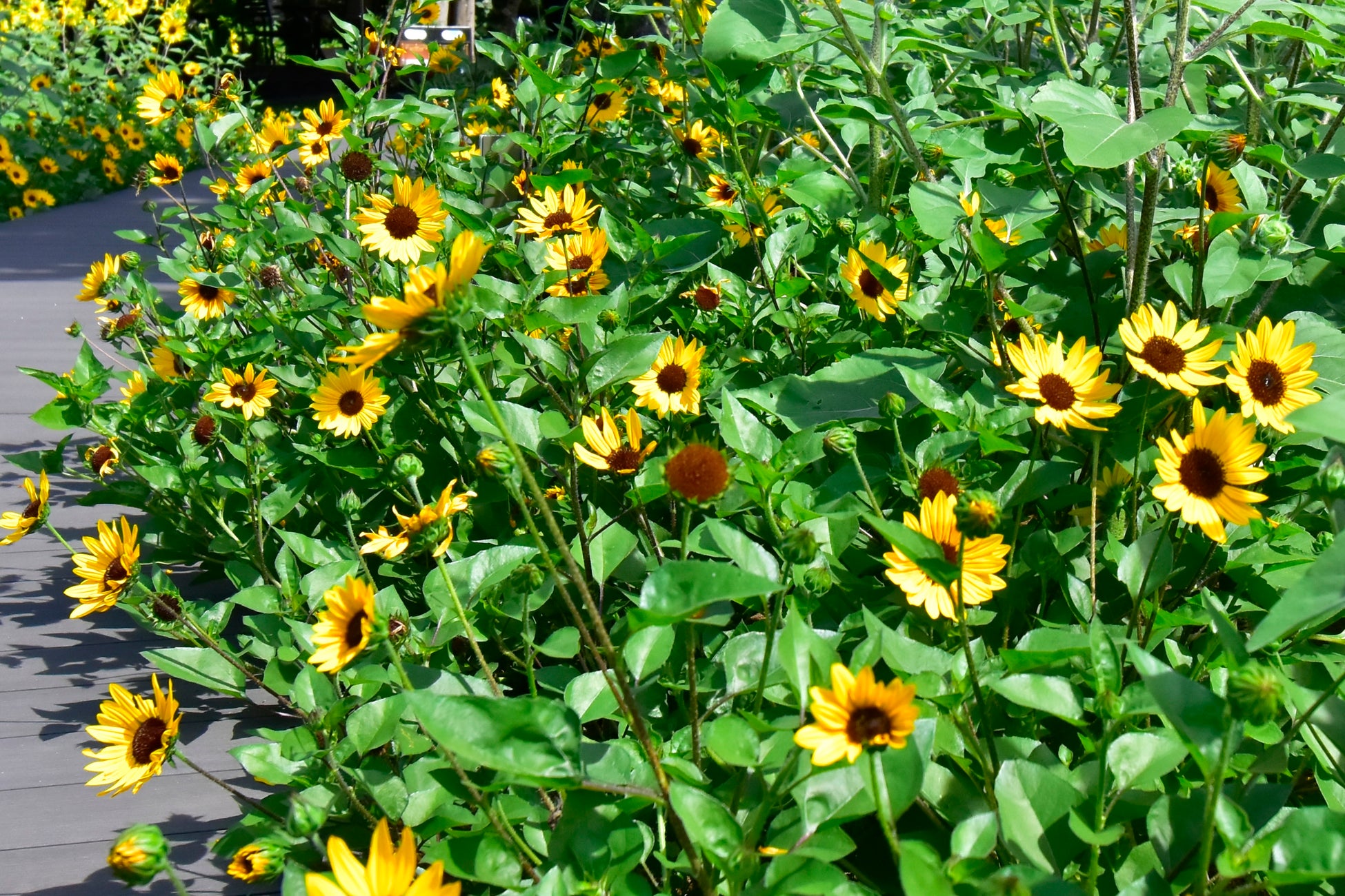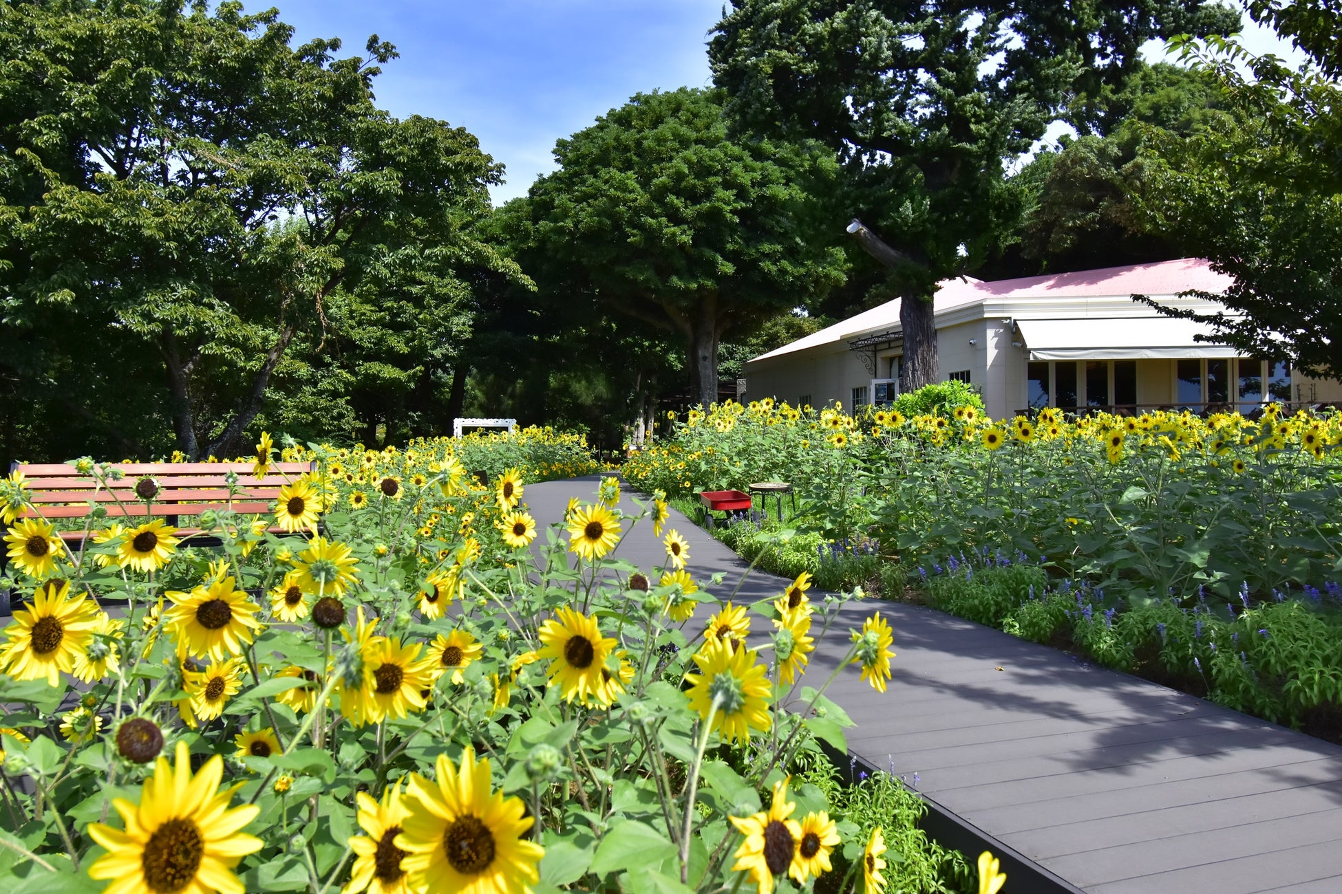 一般的にヒマワリの鑑賞期間は盛夏の2週間程度ですが、当園では次々と開花する新しいタイプの2品種を植栽することにより、9月上旬頃まで元気で明るいイメージの“夏のガーデン”を堪能することができます。