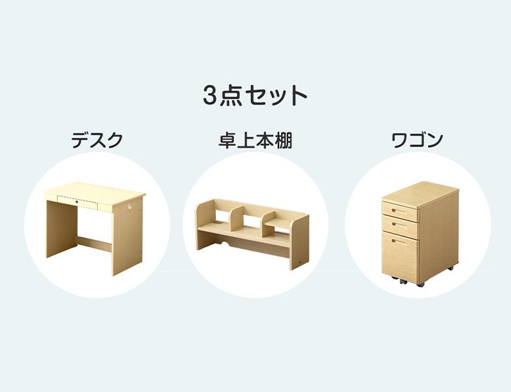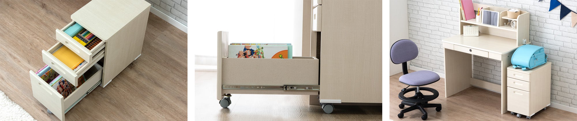 ワゴン収納はノートや教科書などの学習用具を3段に分けて収納することが可能です。キャスター付きなので物を収納したまま移動することもでき、ワゴンをデスクの内側から横に配置することもできます。最下段は引き出しを最後まで引くことができるフルスライドレールを採用しており、奥にしまった物を簡単に取り出せます。また、ワゴンの上にはランドセルを置けるスペースがあるため、お子様の毎日の学校準備もサポートします。