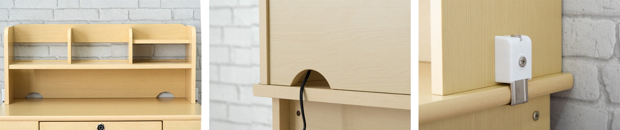 上棚にある棚はお子様でも簡単に取り外しができるので学習デスクをお子様好みにレイアウトすることができます。また、左右にはコンセントやケーブルを通すための穴が開いているため、利き手に合わせてライトを配置でき、タブレットやPCなどを充電しながらご使用いただく場合にも便利です。