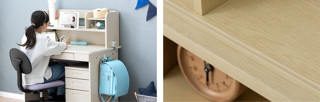 デスクの引き出しには指をかざすだけでロックが解除される指紋認証ロックを搭載しており、お子様がロック解除へのワクワク感を体感しつつ、学習用具や大切な物の自己管理を促すこともできます。
