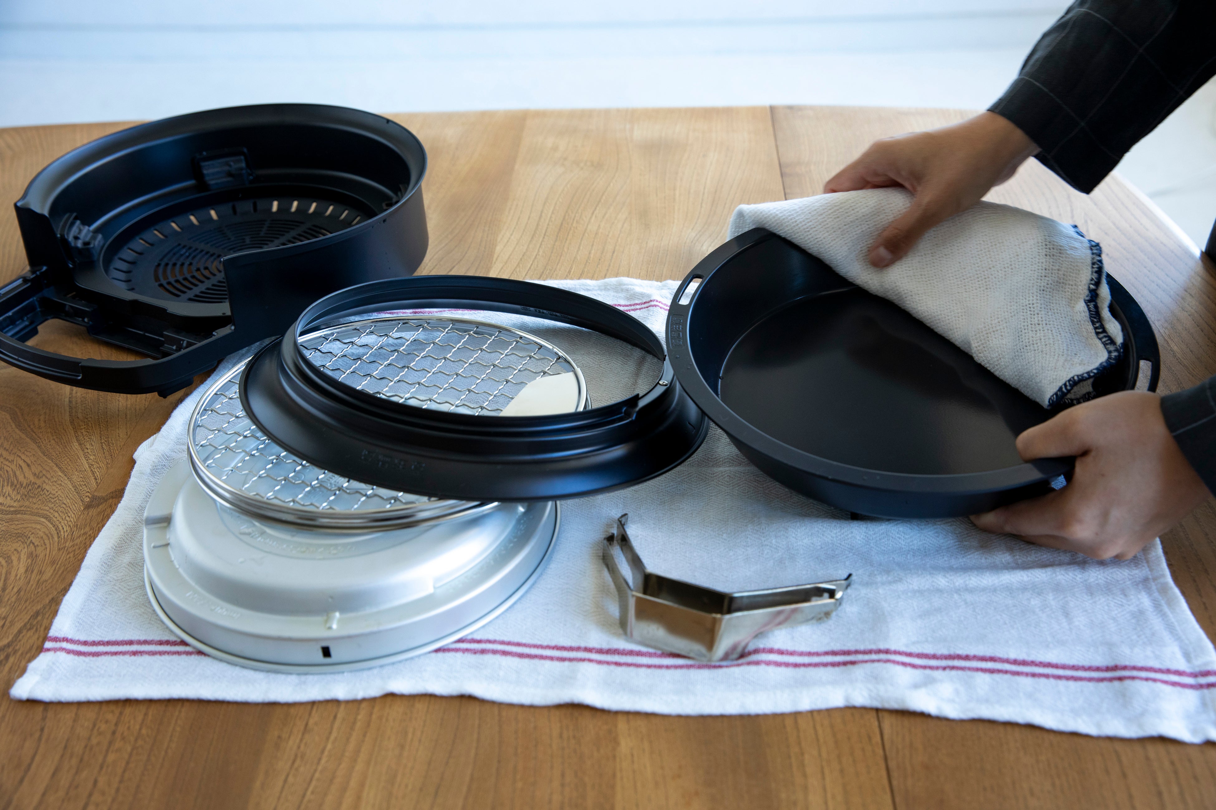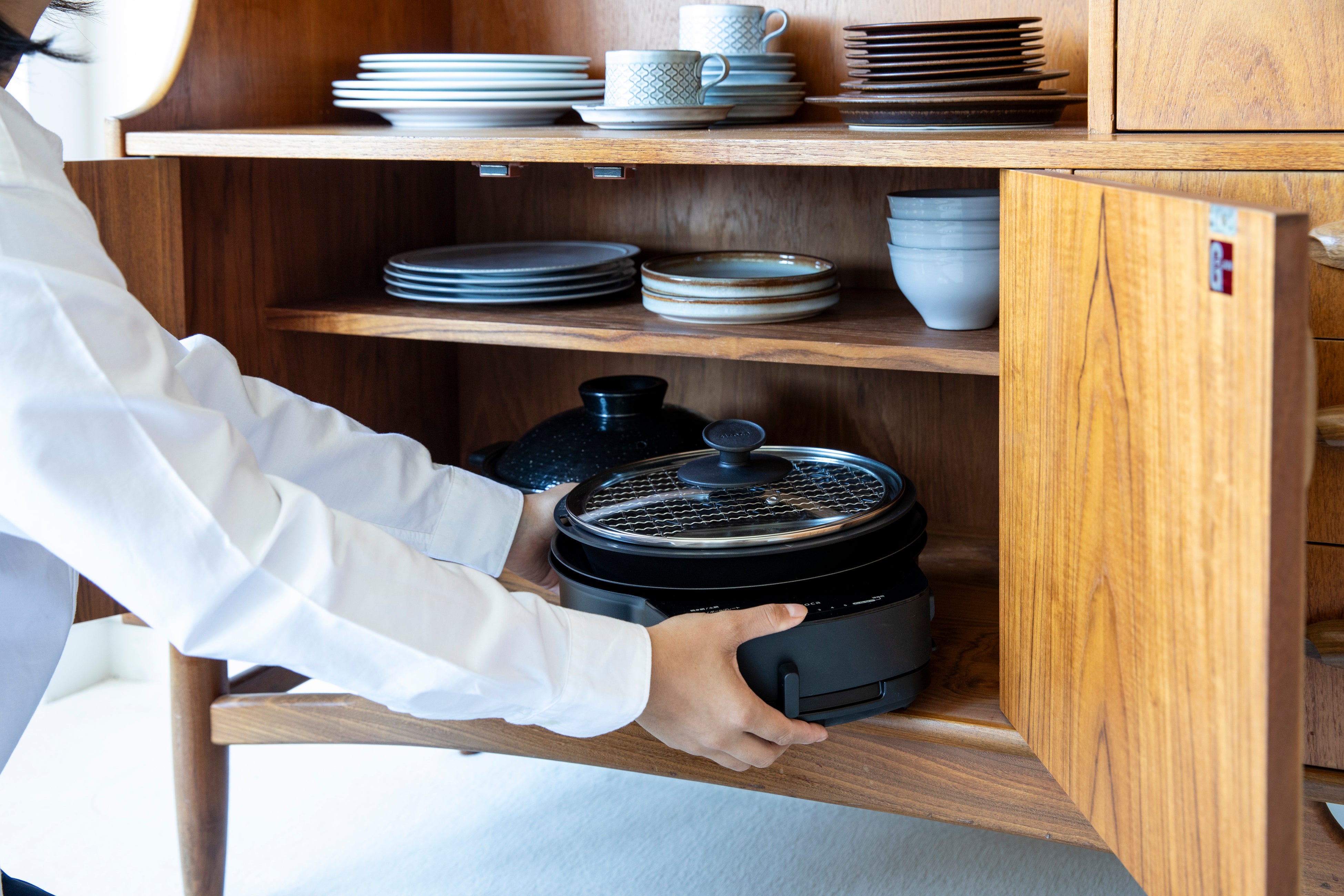 従来の卓上調理家電のお悩みとして多く挙げられるのが、「お手入れが大変」「収納場所に困る」といった声。「おうちいろり」なら、本体パーツをヒーターから外して洗うことができるためお手入れも簡単。また、土鍋を除く付属品はスタッキングでき、すべて重ねても高さは約17.2cmと、場所をとらずにコンパクトに収納することができます。