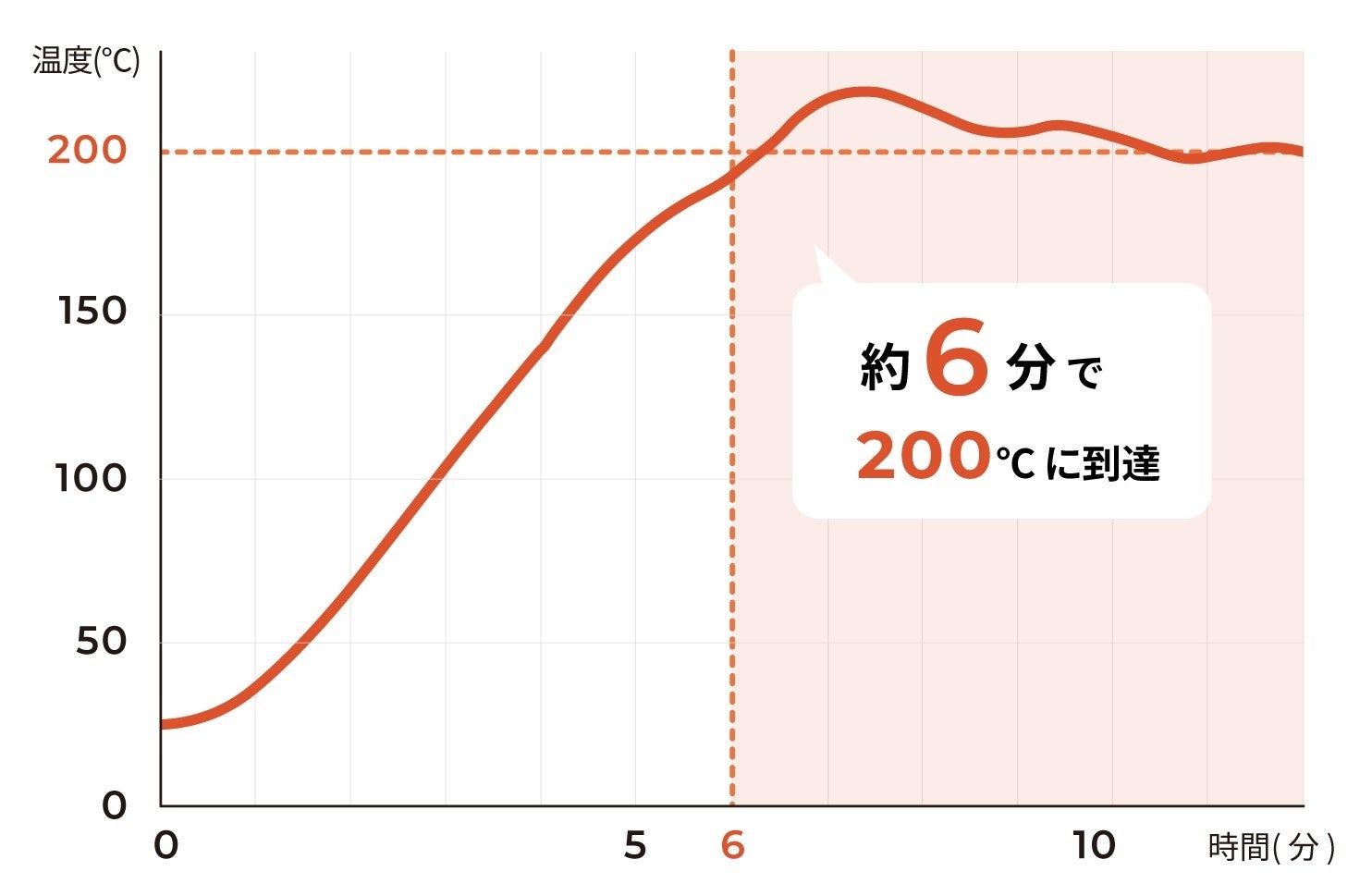 高火力ですばやくプレートをあたため、安定した温度で調理ができるのが「おうちいろり」の大きな特長。熱密度が高く、プレートを効率よく熱することができます。高火力のヒーターによりすばやく設定温度に到達し、食材をすばやく焼き上げます。(深皿を使用した際、200℃に到達するまでの時間は約6分*2)また、鋳物のプレート(深皿・ボールプレート)は蓄熱性にも優れているため食材をのせても表面温度が下がりにくく、食材をムラなく美味しく仕上げます。温度は料理に合わせて、1~5の5段階で設定可能です。