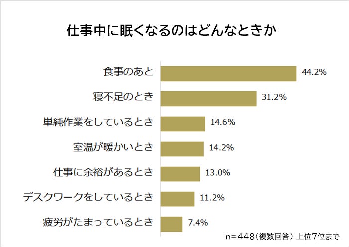 1位になったのは「食事のあと(44.2%)」です。2位「寝不足のとき(31.2%)」、3位「単純作業をしているとき(14.6%)」と続きます。