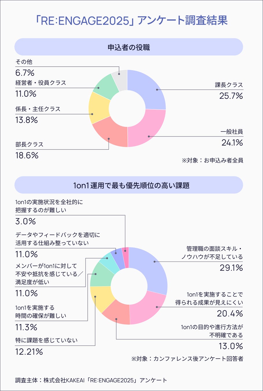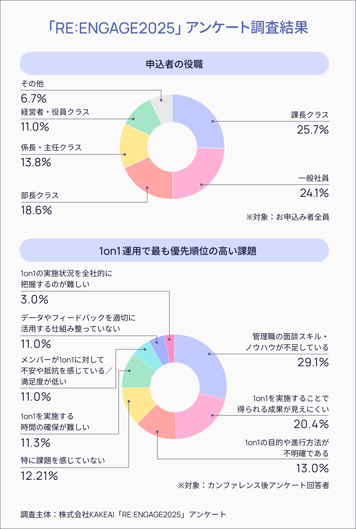 その中心にあるのが「1on1」。エンゲージメントの向上、成長支援の加速といった課題に応える有効な手段です。しかし現実には、形骸化や負担増、属人化といった 問題が生じています。KAKEAIは、1on1コミュニケーション支援領域の知見をもとに多様な業界・業種立場の方の実践知の共有に向けて「RE:ENGAGE 2025」を開催いたしました。