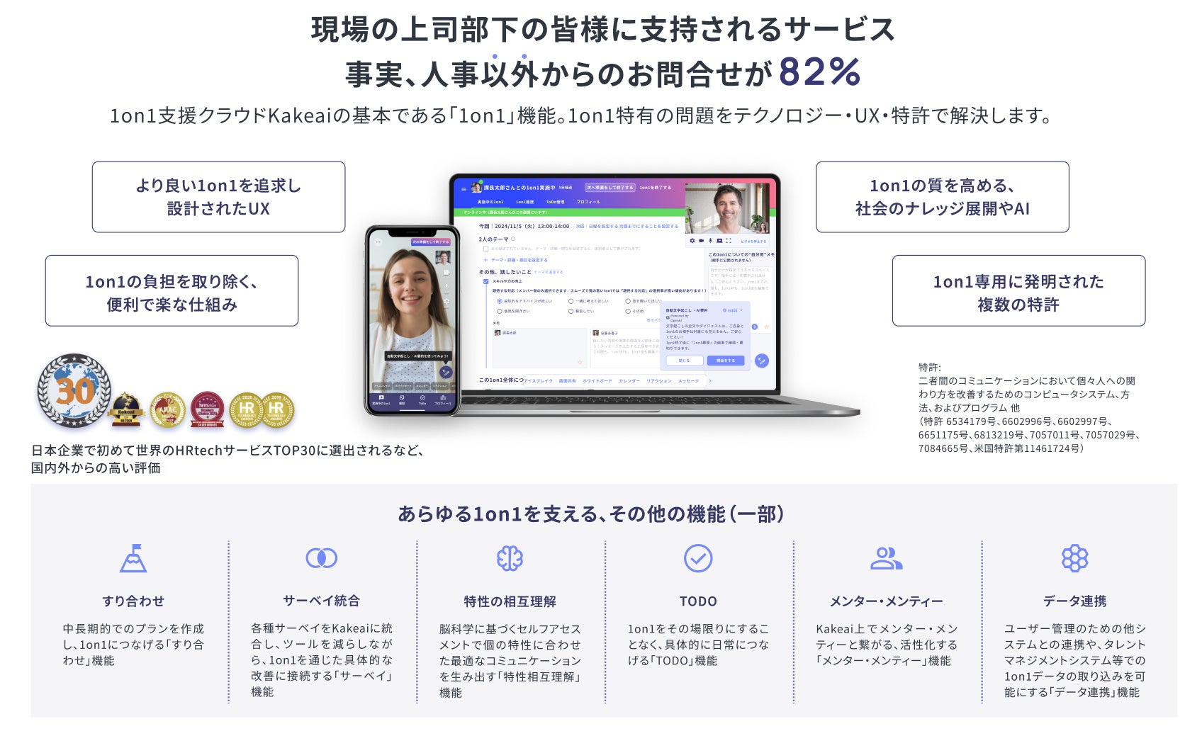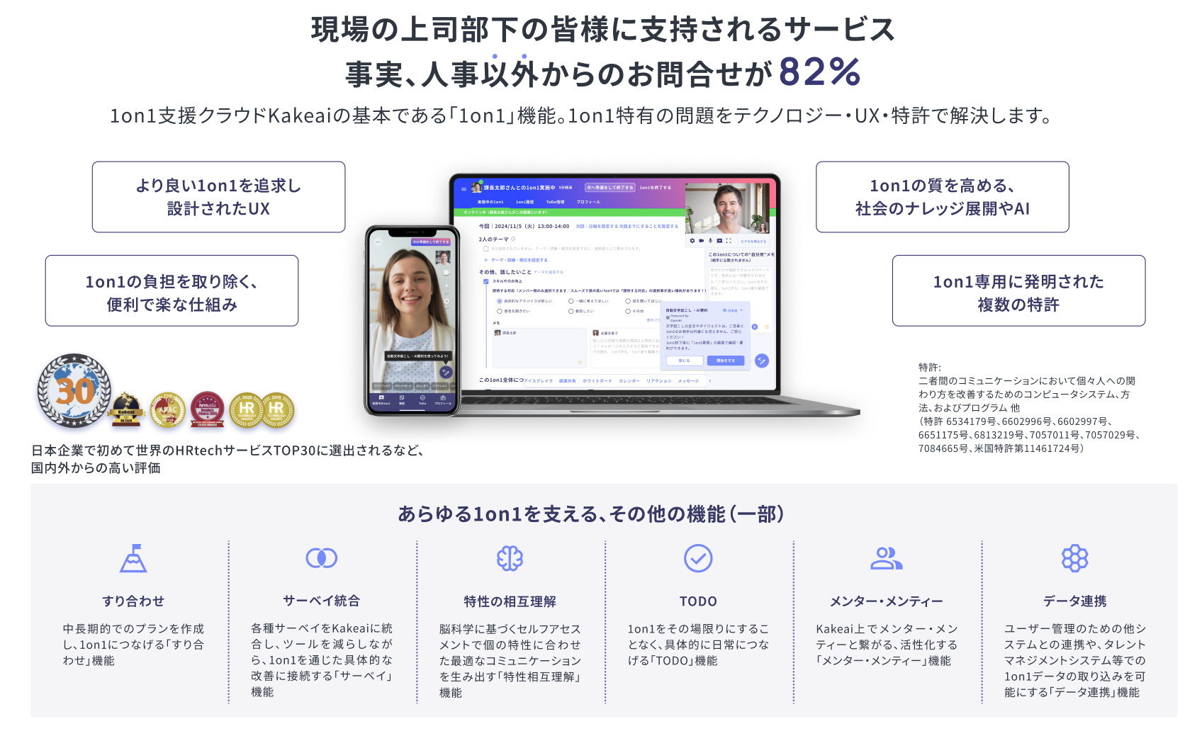 1on1ツールKakeaiは、複数の特許やAI・テクノロジー、また数十万人のKakeaiユーザーが日々実施する1on1のデータを活かし「現場の上司部下、および経営・人事の皆様の1on1にかかる負担を減らしつつ、質の高いコミュニケーションを生み出すツール」です。従業員数名の企業から数万人の企業、病院、学校、保育園、介護施設、飲食店等、あらゆる業種・職種の皆様にご利用いただいています。