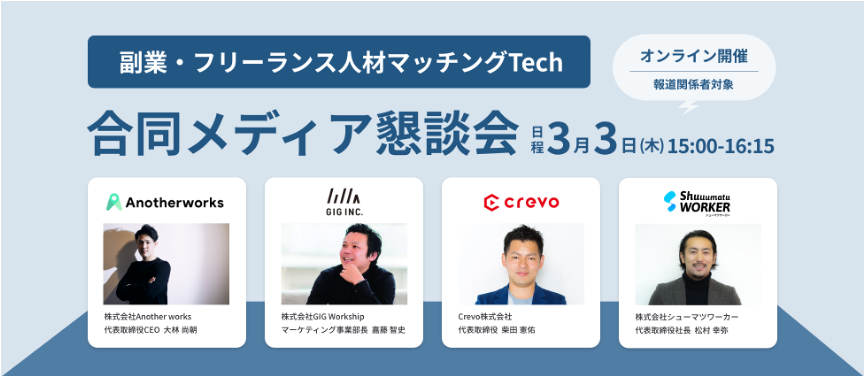 副業・フリーランス人材マッチングTech領域で成長を続ける株式会社Another works、株式会社GIG、Crevo株式会社、株式会社シューマツワーカーは、報道関係者を対象とした合同メディア懇談会を2022年3月3日(木)15時よりオンラインにて開催致します。