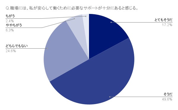 「職場には、私が安心して働くために必要なサポートが十分にあると感じる」という質問に対して、66.8%の従業員が「とてもそうだ」「そうだ」と回答し、数値として高評価とは言い難い結果となった。