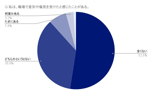 「私は、職場で差別や偏見を受けたと感じたことがある」については、88.4%の従業員が「全くない」「どちらかというとない」と回答。数値としては高いが、弊社は7つのゼロ(※3)を掲げているため、この項目では特に「0」を目指して改善が必要である。
