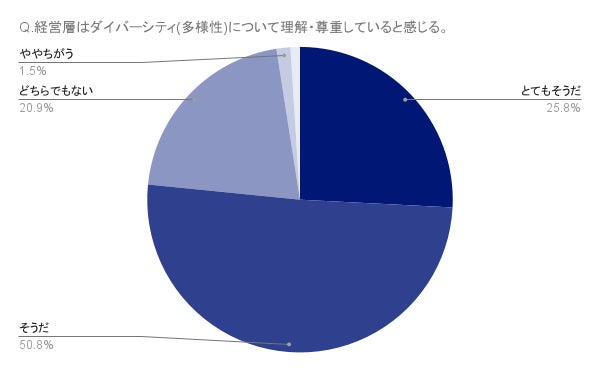 「経営層は多様性について理解・尊重していると感じるか」という質問に、76.6%の従業員が「とてもそうだ」「そうだ」と回答した。