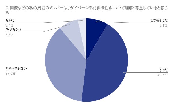 また、「同僚などの私の周囲のメンバーは、ダイバーシティ(多様性)について理解・尊重していると感じるか」という質問には、51.9%の従業員が「とてもそうだ」「そうだ」と回答している。経営層が多様性への理解について高評価を受けている反面、経営層以外はまだまだ理解や尊重が不十分と判断されていることが分かる。ダイバーシティの理解・尊重促進を図るため、より一層の情報発信や研修実施の検討が必要である。