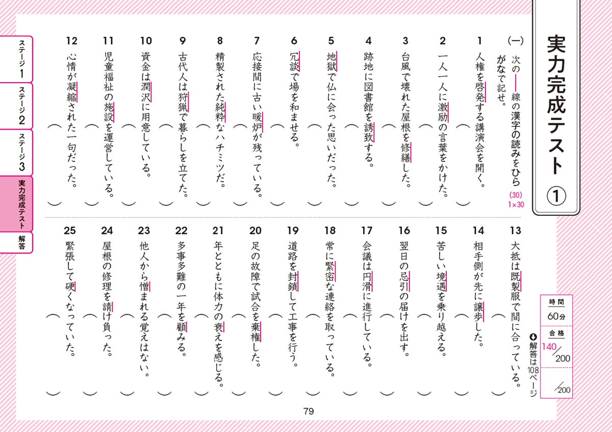 巻末には検定と同じ出題形式・問題数で構成した「実力完成テスト」を2回掲載しています。