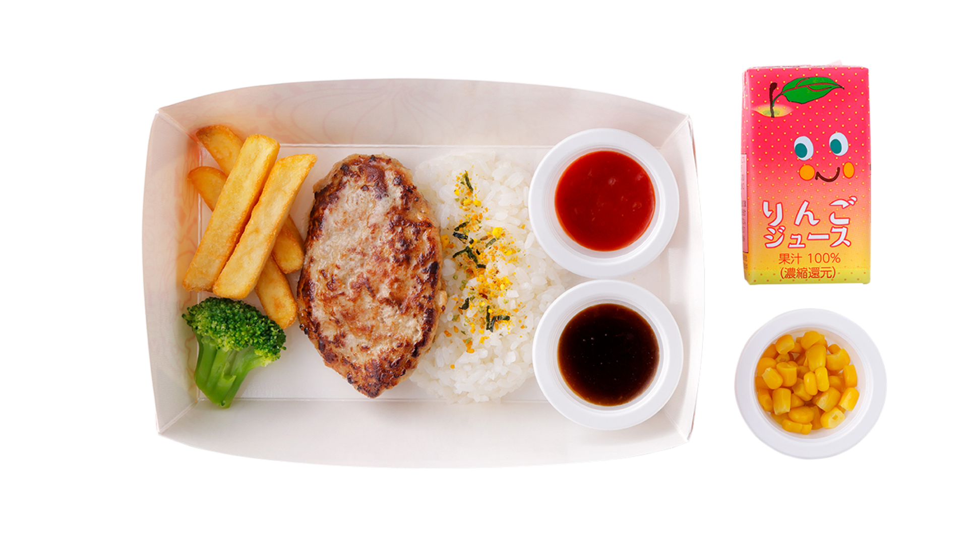 びっくりドンキーのハンバーグをおこさまサイズに。フライドポテトや野菜と一緒に盛り付けました。ハンバーグはドンキー独自の厳格な安全基準のもと、自然に近い環境で育てたビーフとポークの合挽肉を使用しています。リンゴジュース付き。