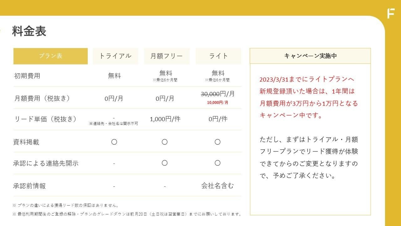 なお本キャンペーンは、まずトライアル・月額フリープランで資料を掲載し、リードが獲得できたことを確認したのちに適用されます。詳しくはお問い合わせください。