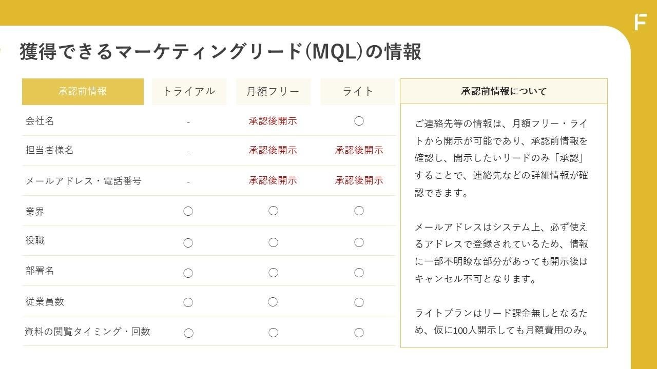 ・従量課金なしで全リードの詳細情報(会社名・担当者名・連絡先)を開示