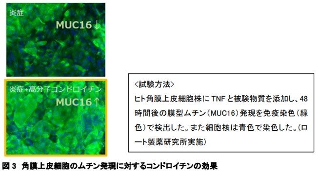 さらに、涙液の安定性に寄与する膜型ムチン(MUC16)を評価したところ、炎症によって膜型ムチン(MUC16)の発現が低下するのに対して、高分子コンドロイチンはその発現を促進・維持することがわかりました(図3)。
