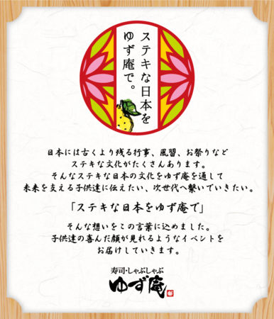 『ゆず庵』では「ステキな日本をゆず庵で。」というお子様向けのイベントを毎月開催しております。和食のみならず、日本の良き文化を、『ゆず庵』を通じてお子様に知ってもらう機会を作りたいという想いから始まりました。未来を担うお子様たちの心に、ステキな日本が伝わり伝承されていくきっかけをゆず庵から発信してまいります。