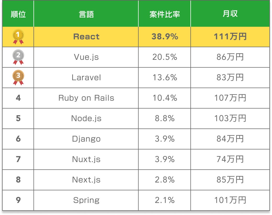 案件数ランキング1位はReact