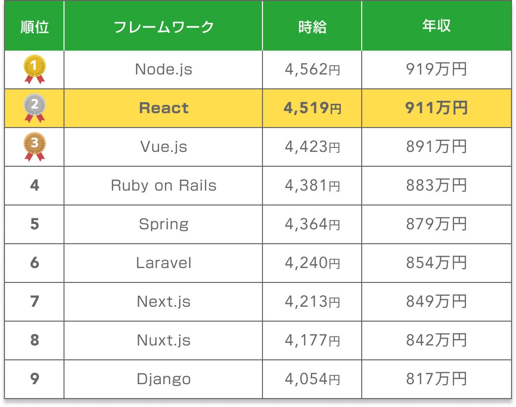 React案件では、平均年収が911万円となっており、言語年収ランキングでは2位という結果になっています。Node.js(919万円、1位)とはわずか8万円差という僅差です。