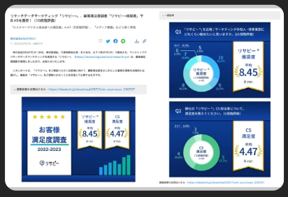 「リサピー®︎ forCS」は、これまで内部改善施策のみとして実施されてきたこの「顧客満足度調査」を、「マーケティングコンテンツ化」し、プロモーションや購買促進など外部に訴求可能な形にして納品することで、調査結果を最大限にご活用いただくソリューションをご提供いたします。