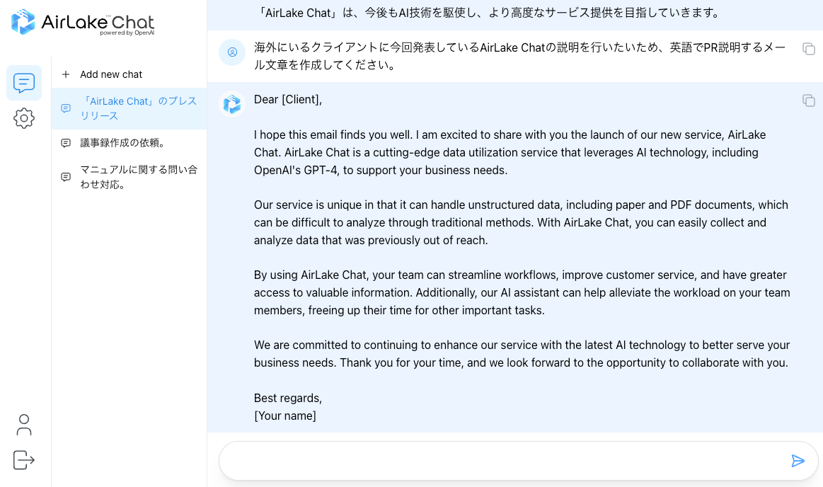 新たなドキュメントの作成支援や、議事録や複雑な文章の要約に活用でき、文章読解・作成を効率化します。箇条書きで入力した内容から「AirLake Chat」で文章を生成したり、過去の提案データを「AirLake Chat」から必要な機能や特長を学習し顧客ニーズにあわせた新たな提案書の文章を生成することも可能です。
