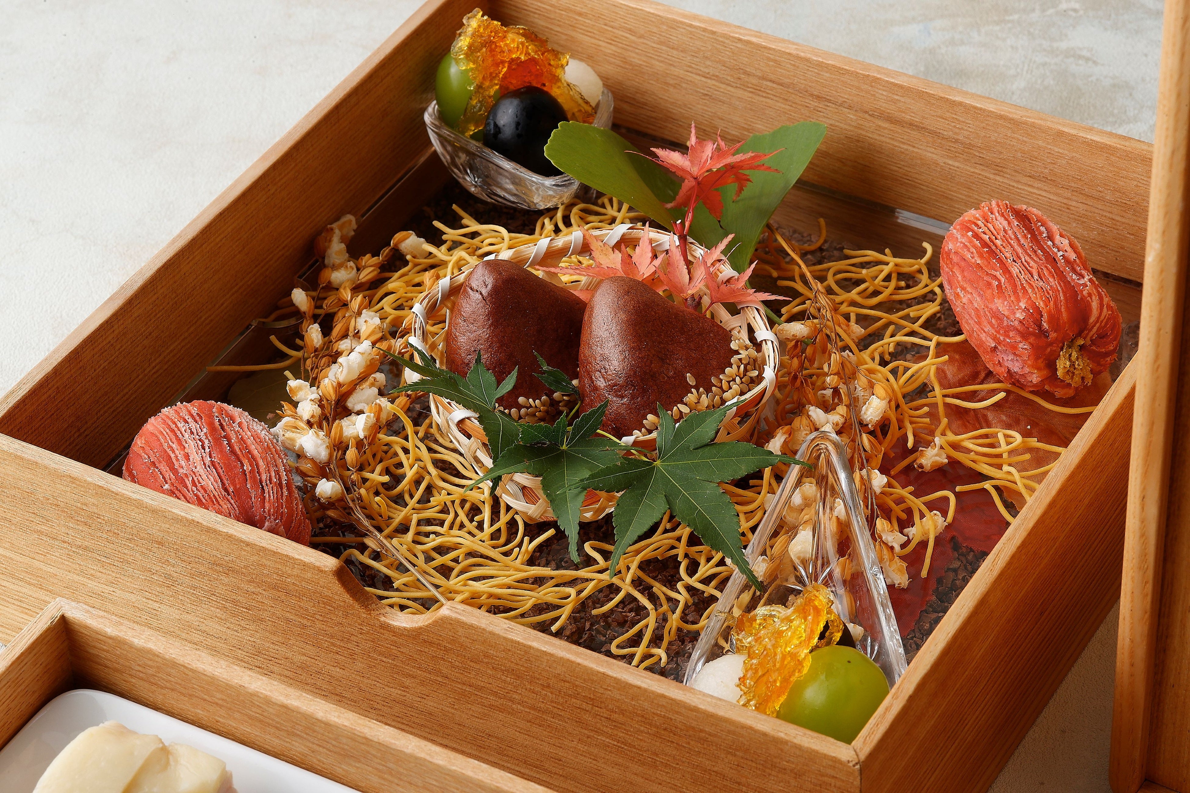 栗に見立てた「栗饅頭」は、カカオの香りのする生地の中に、フランス栗を使用した餡が中からとろけます。「ナツメに見立てた揚げ菓子」は、ビーツで色付けしたサクサク千層酥(中華パイ)の中に蓮の実餡を忍ばせています。楊貴妃も愛したという「燕の巣」は食べる美容液ともいわれ、体にしみわたるようなサラリとしたのど越しです。旬のフルーツも添えて。