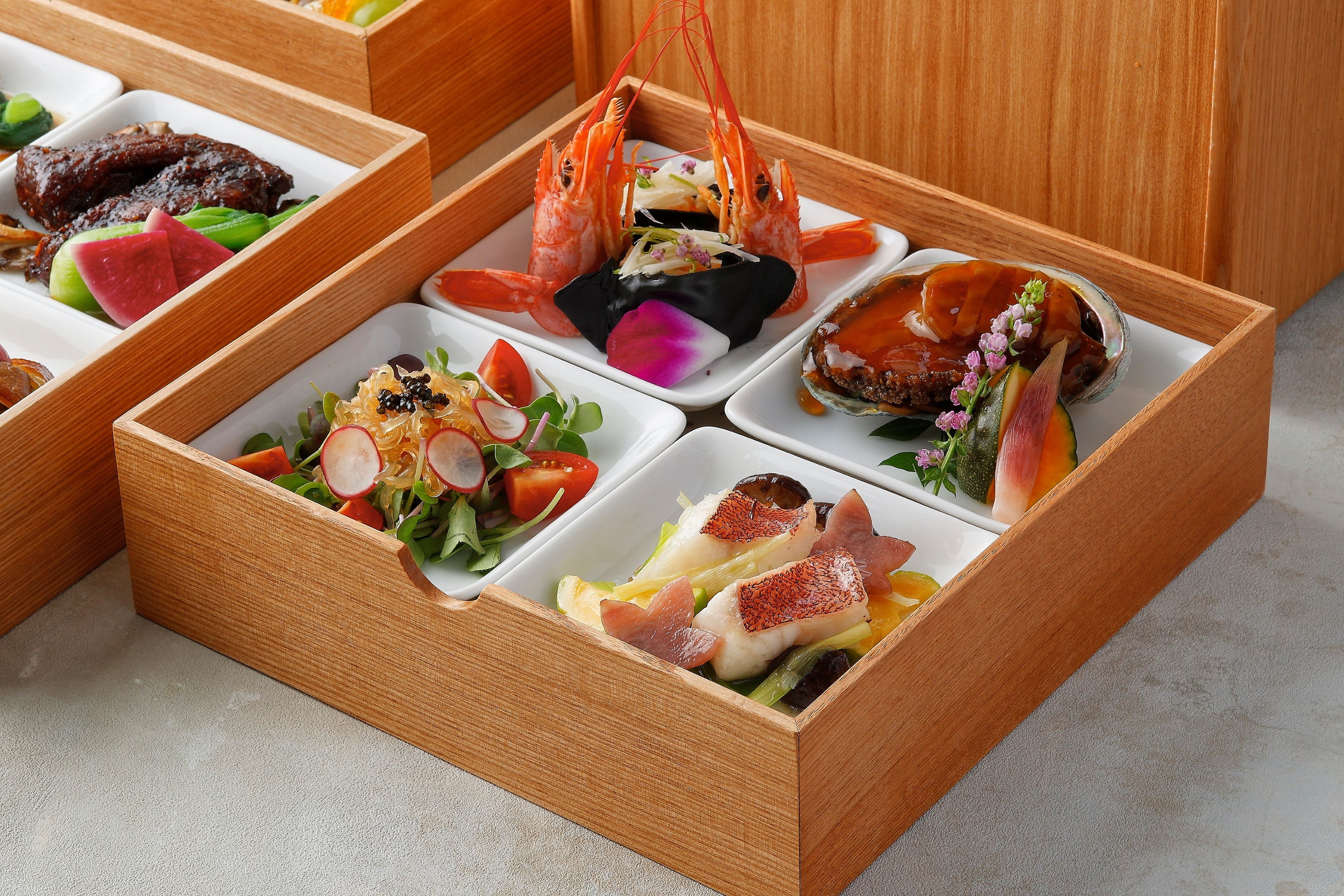 この門外不出の「モダンシノワーズ」を味わえて、リピートも多く人気を博すインルームダイニングプラン「美食同源の宝箱」が、素材を吟味し新メニューへと昇華しました。体調を崩しがちな季節の変わり目、食により美容と体質改善をサポートする“美食同源”をテーマにし、1日5組インルームダイニング限定で美味を詰め込んだ宝箱のようなボックス重をご提供します。余計なものは一切使用せず、素材からうま味を引き出した「中華だし」にこだわり、国産素材の味を引き立てています。さらにパワーアップした厳選素材を詰めこんだ体にも優しい味わいをご堪能ください。宝箱に隠れているサプライズな演出もお客様からご要望があればご対応しております。(器の下に、メッセージプレートなど忍ばせることができます。)