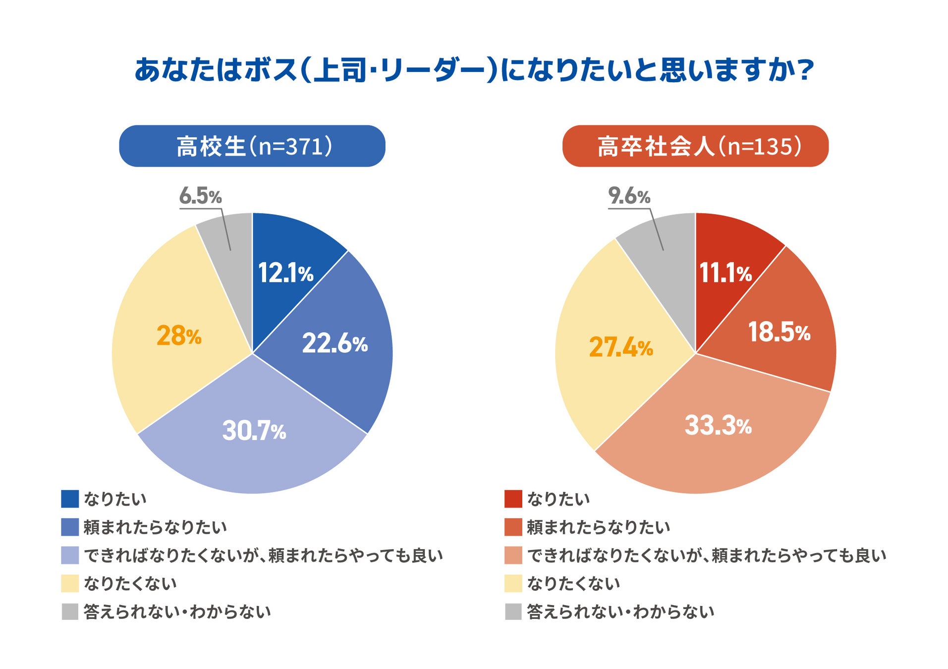 現役高校生と高卒の社会人に「ボス(上司・リーダー)になりたいと思いますか」とそれぞれ聞いたところ、「なりたい」と答えた人は高校生で「12.1%」、高卒の社会人では「11.1%」でした。いずれも「頼まれたらなりたい」「できればなりたくないが頼まれたらやっても良い」と合わせると、半数ほどが回答する結果になりました。