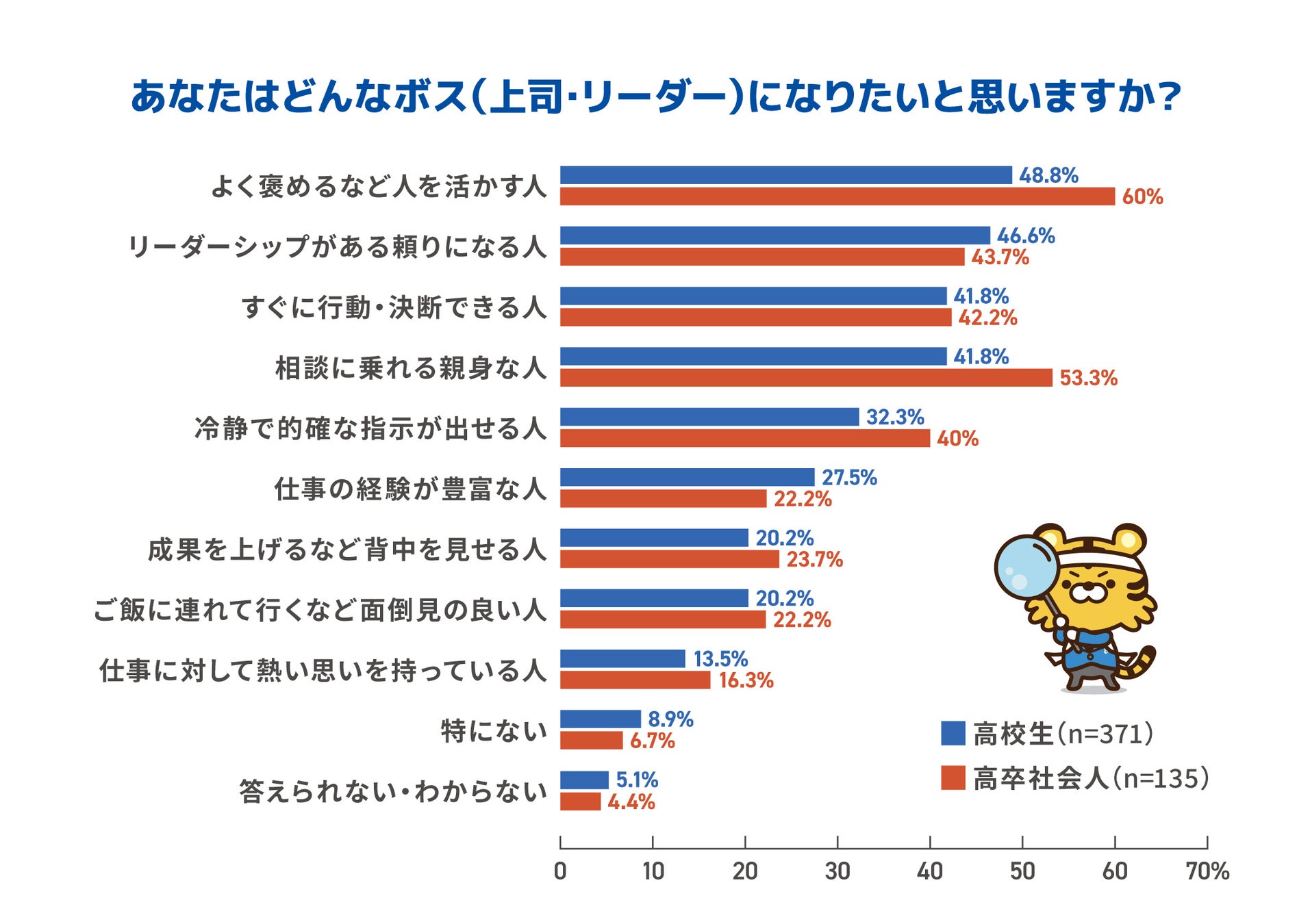 このことから高校生・高卒の社会人の世代は、一人一人をよく見て成長させることができる人に、理想の上司像を重ねていると考えられます。